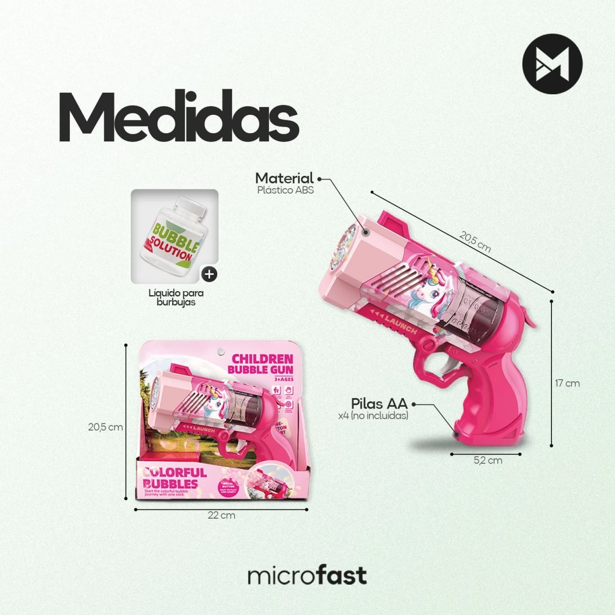 - Incluye: Botella de solución de burbujas y correa.