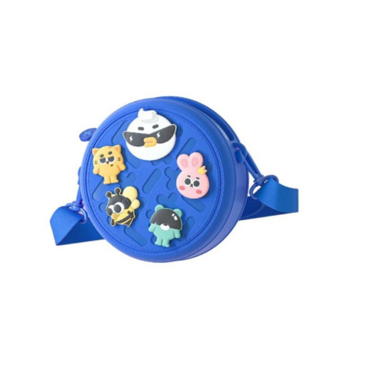 Lleva tus accesorios con estilo con este bolso redondo de EVA con pines azul. Ideal para salidas y uso diario infantil.
