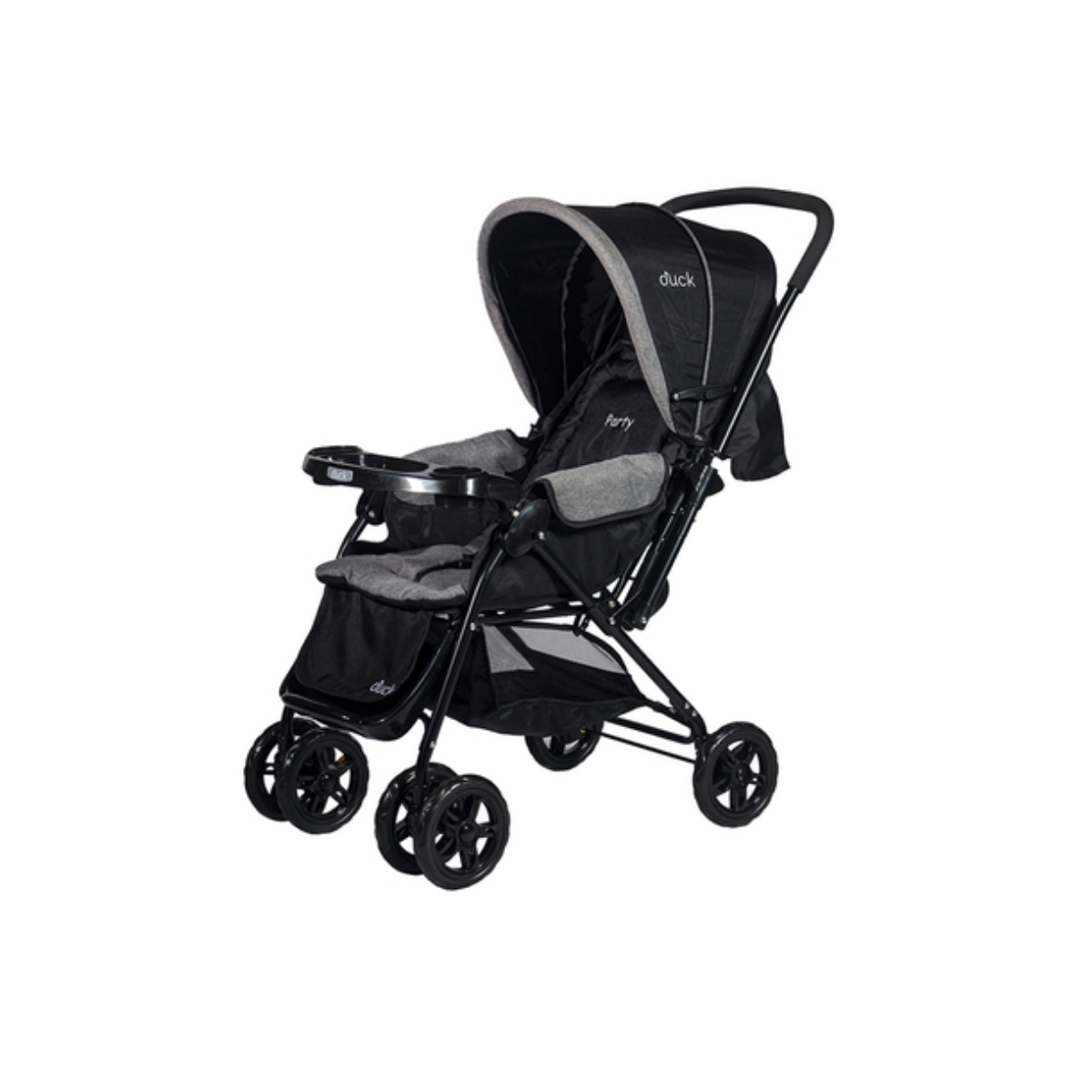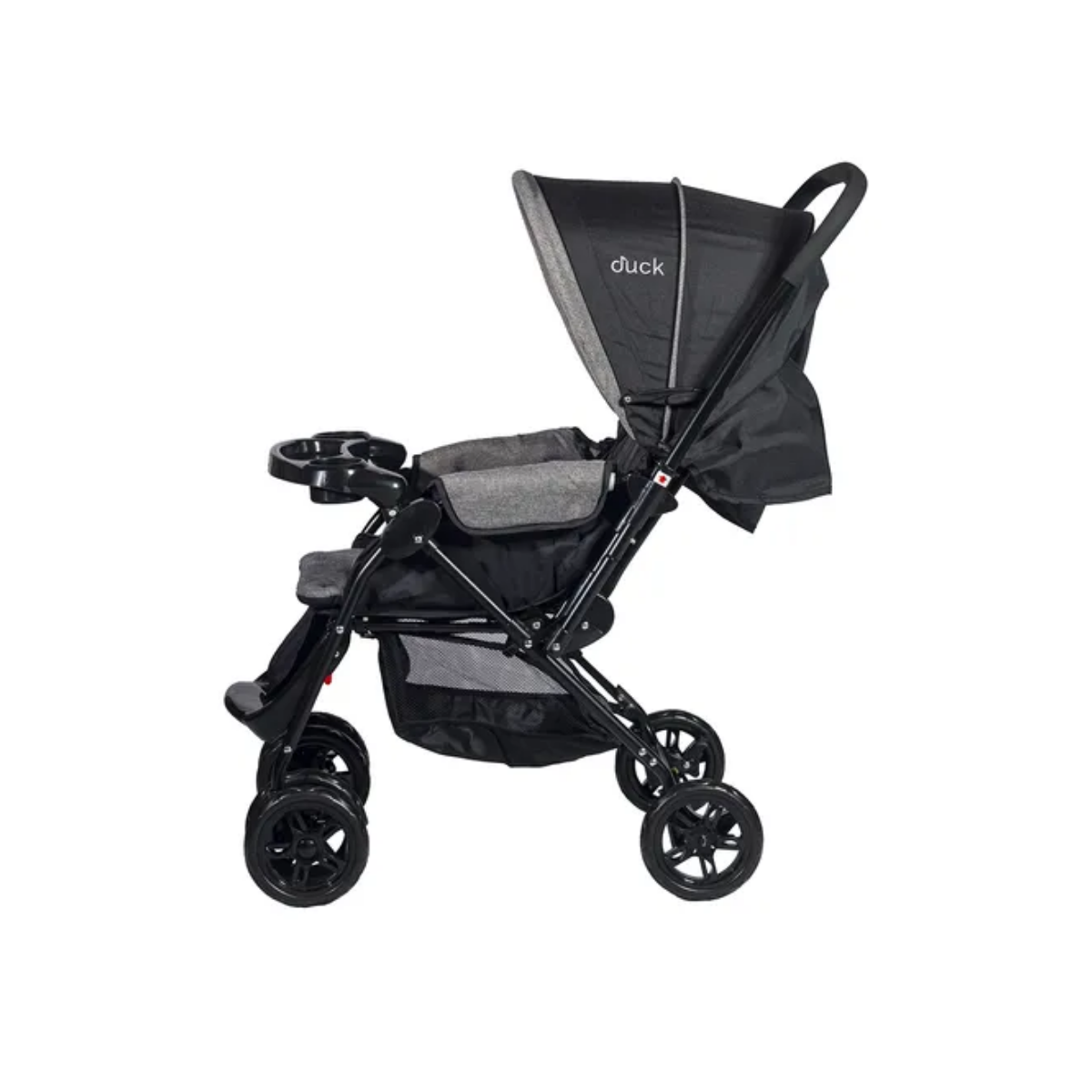 Cochecito de juguete para muñecas con diseño gris, ideal para paseos imaginarios y juegos de cuidado.