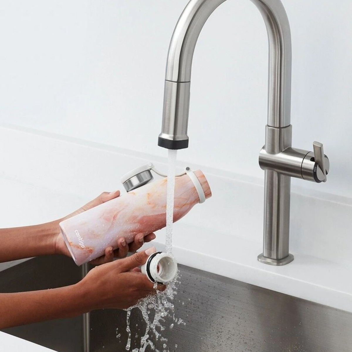 La tapa SnapSeal es de una sola pieza y es completamente a prueba de derrames cuando está cerrada, ideal cuando estás en movimiento. Su boca ancha te permite agregar cubitos de hielo fácilmente. Es resistente, segura, fácil de llevar en una sola mano y cabe en el portavasos de tu auto. Además, es totalmente libre de BPA.