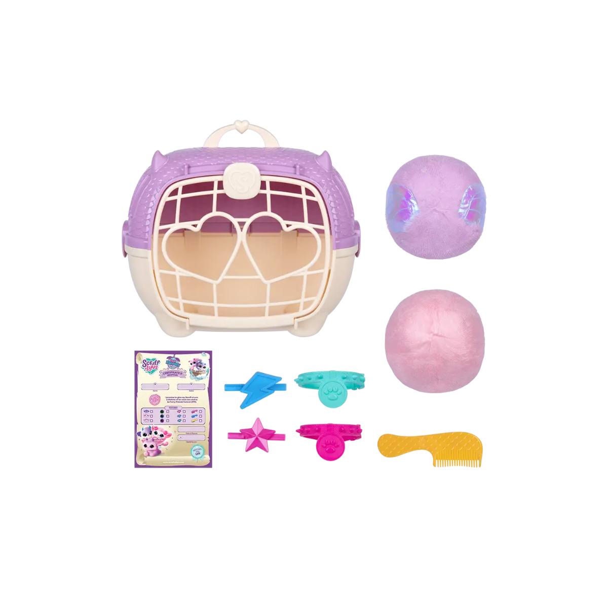 - Contenido del Set: 2 Gemelos, 1 transportadora de lujo, cepillo, collar, clip y certificado de adopción.