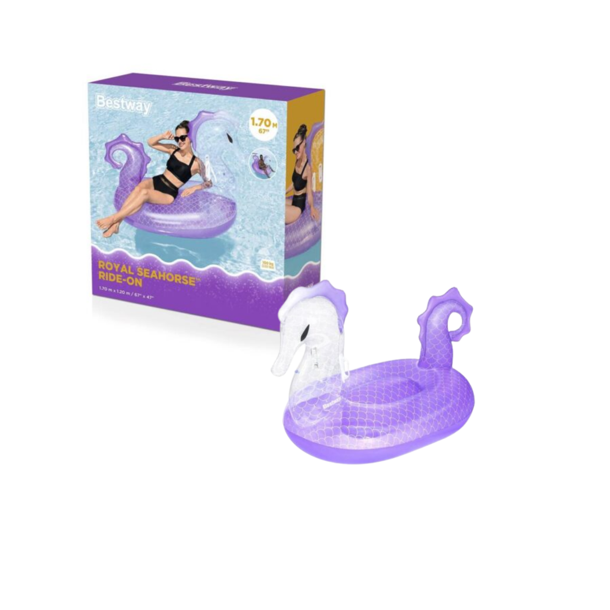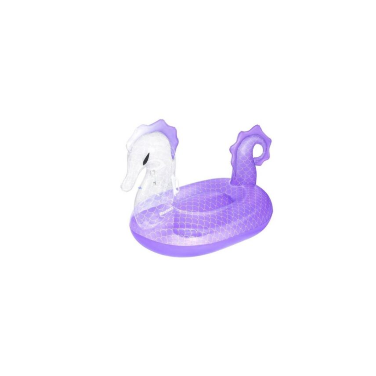 Inflable en forma de caballito de mar con colores vibrantes para flotar con estilo.
