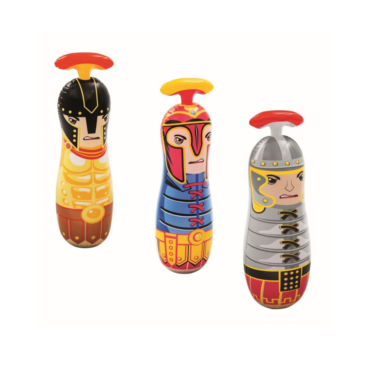 Su característica principal es la cámara de agua incorporada en la base, que garantiza una estabilidad sin complicaciones: se mantiene firme en su lugar y siempre vuelve a levantarse después de cada golpe. Además, cuenta con una reproducción gráfica de calidad de un guerrero gladiador que encantará a los pequeños luchadores.