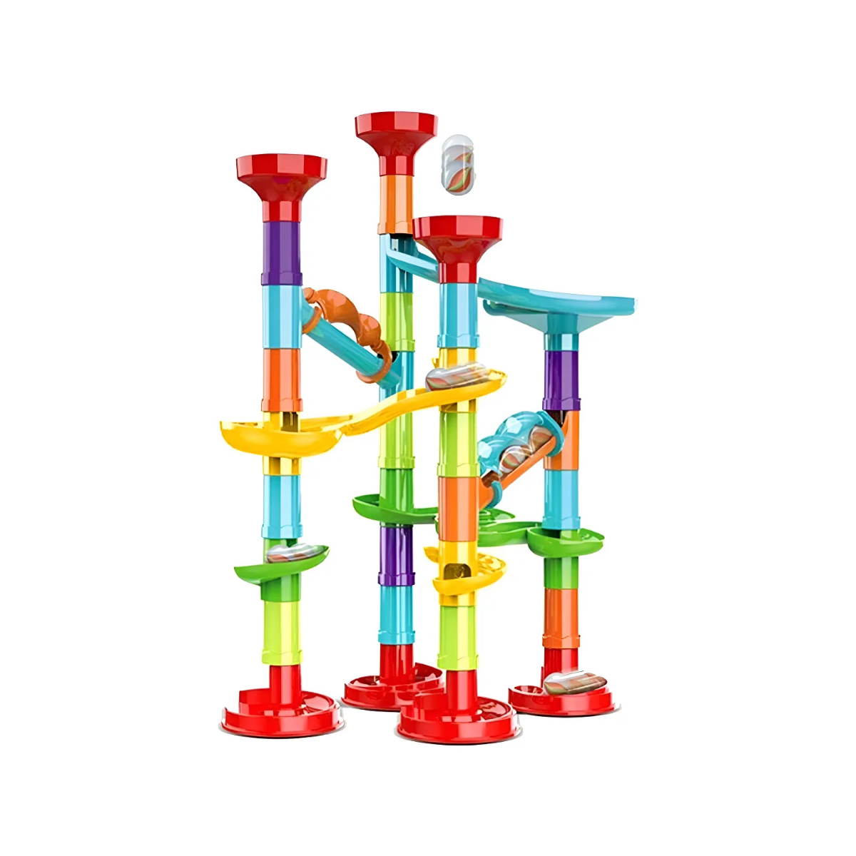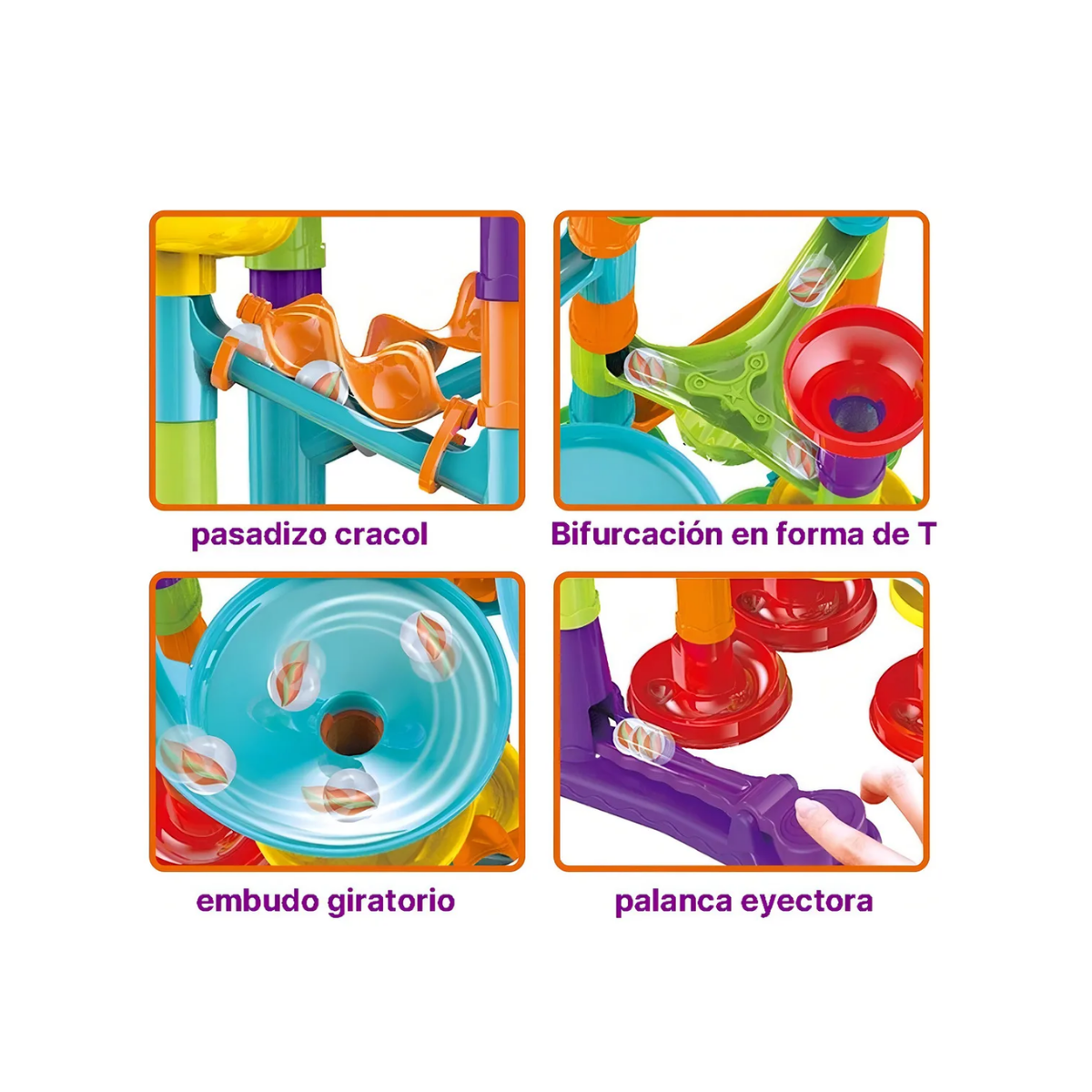 - Mecánica: construcción libre con piezas encastrables y pista de recorrido para bolitas.