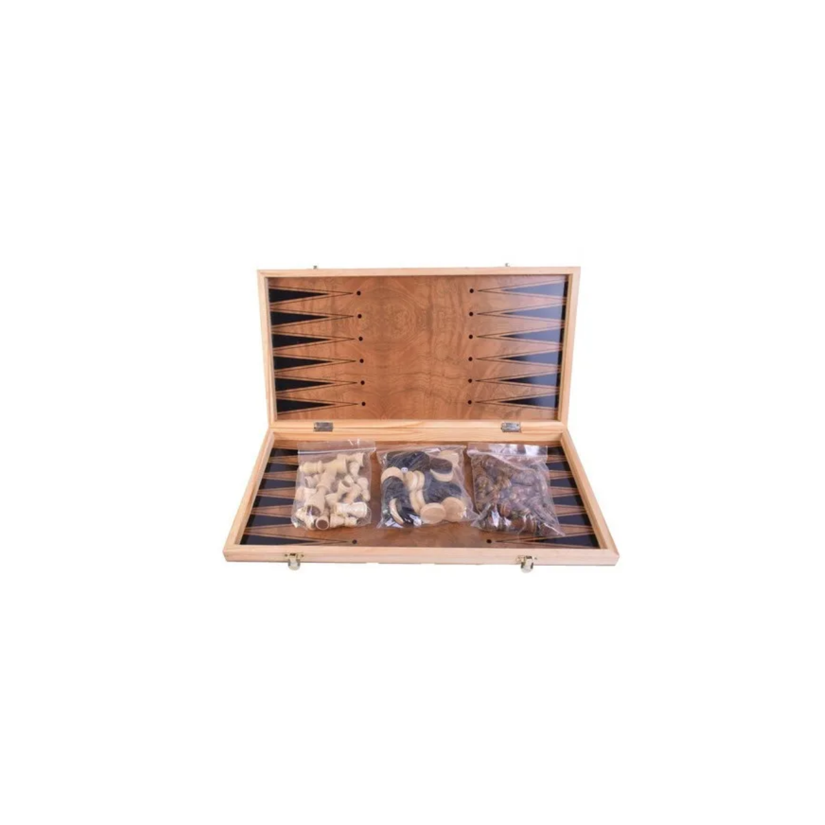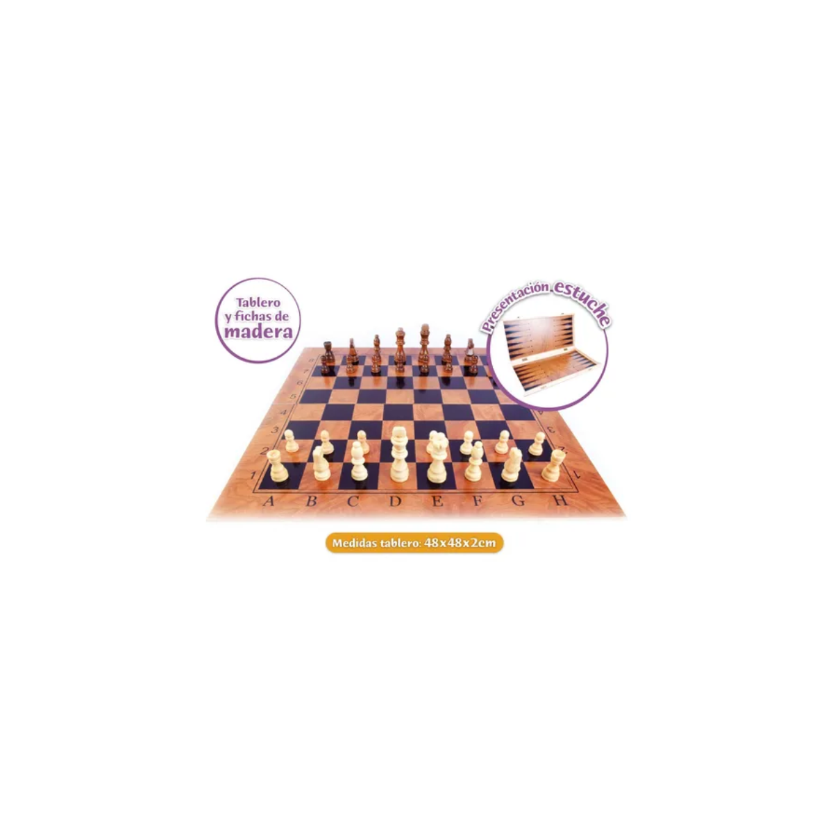 El tablero está fabricado en madera y es plegable, lo que facilita su almacenamiento y transporte. Los tres juegos incluidos (generalmente Ajedrez, Damas y Backgammon, aunque no especificados) vienen con todas sus piezas. Es el set perfecto para llevar de viaje o disfrutar en casa.