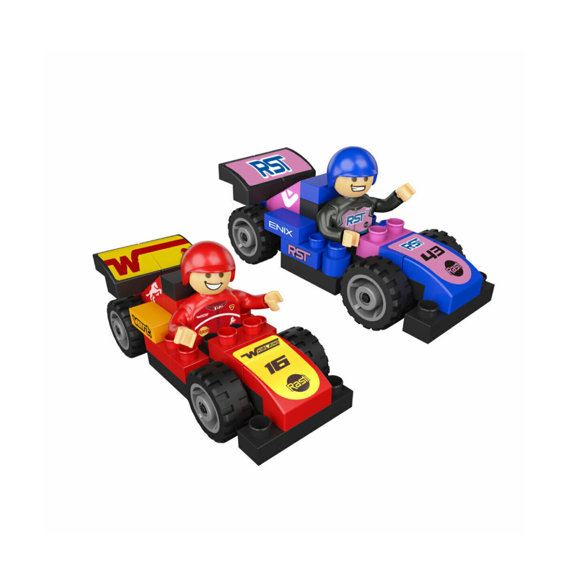Armá tus propios autos de carrera y preparate para la gran competencia. Con este set podés construir dos veloces autos y elegir a tus pilotos para desafiar la pista.