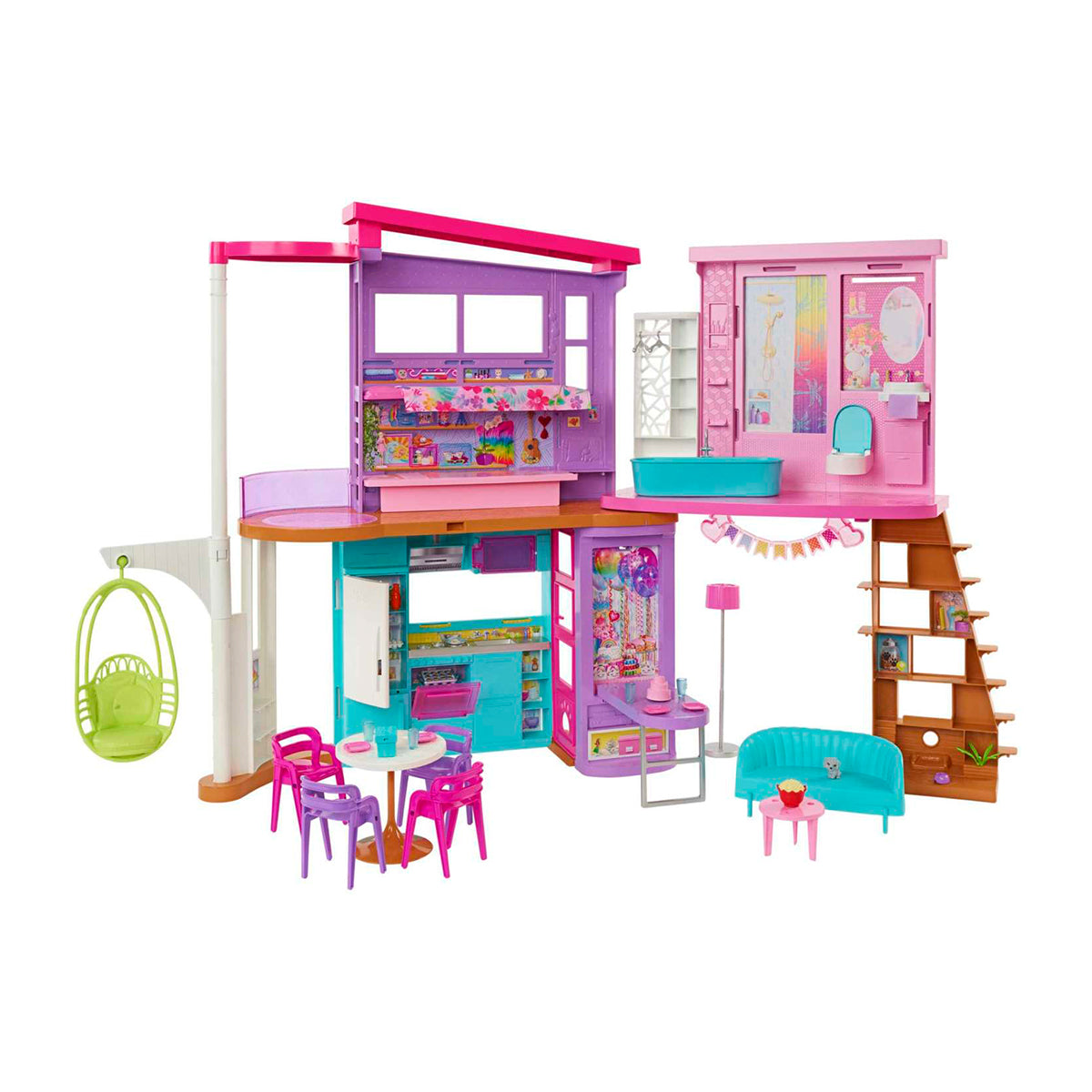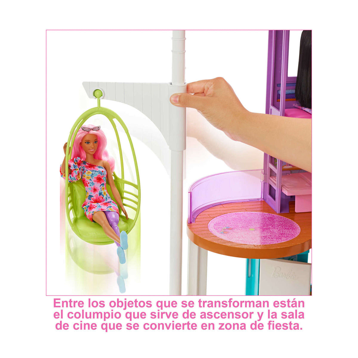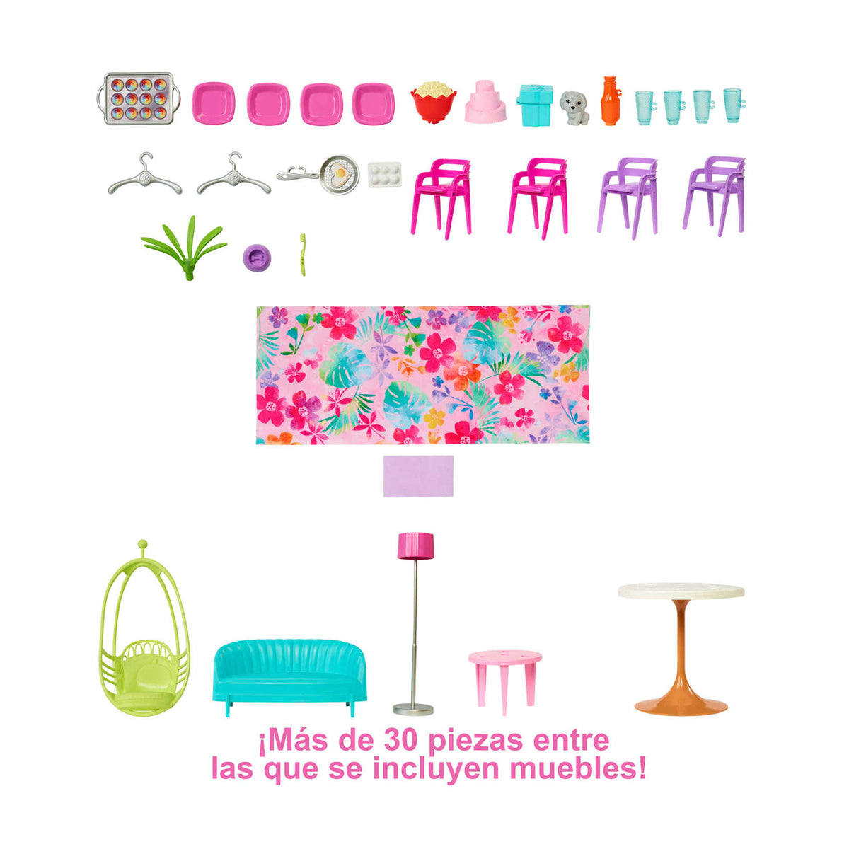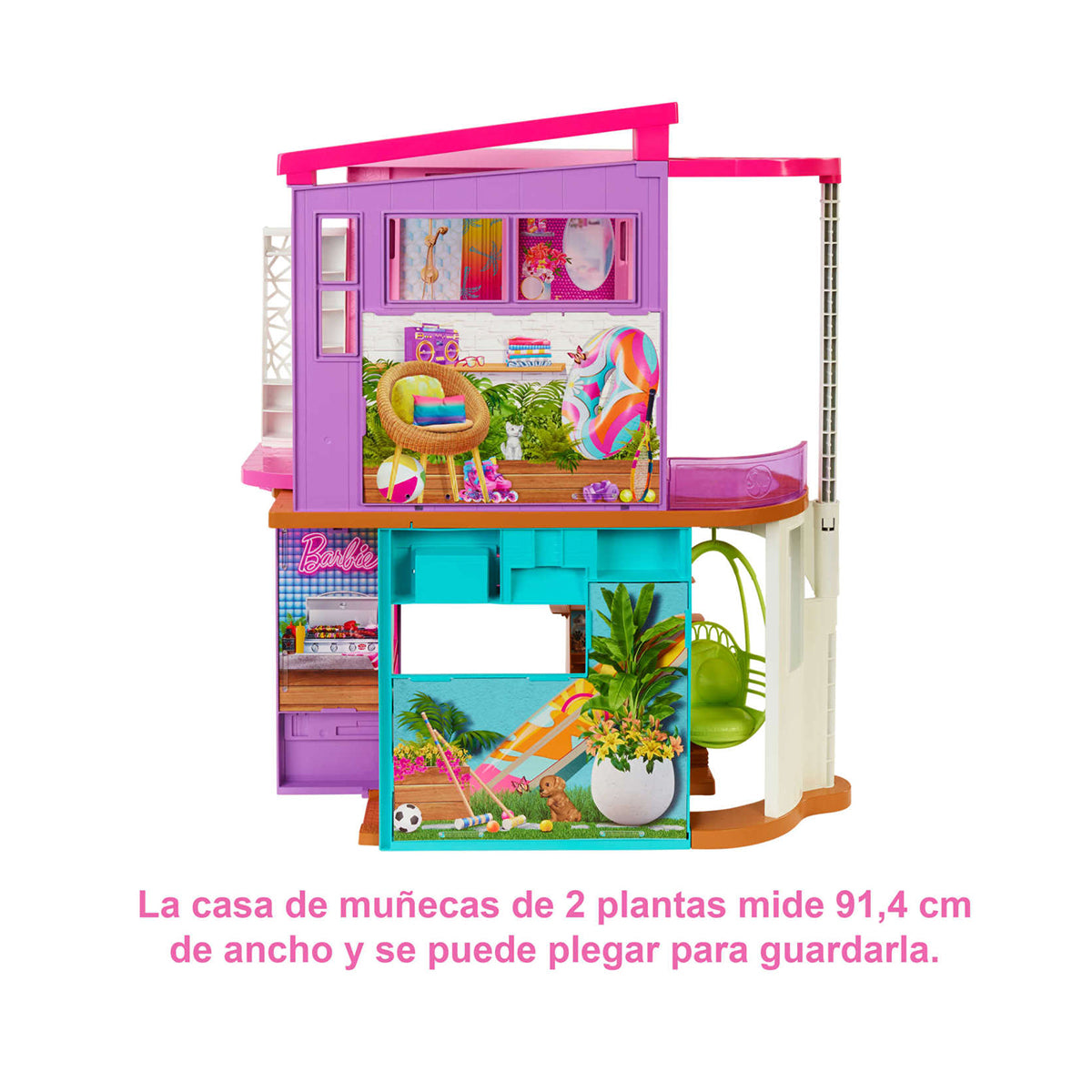 Descripción: Las niñas pueden recrear sus vacaciones de ensueño con el conjunto de juego de casa de vacaciones de Barbie. Cuando la imaginación entra en esta casa de muñecas de Barbie de 2 pisos, las niñas descubren un sinfín de posibilidades de juego con las seis zonas de juego que incluyen dormitorio, baño, cocina, comedor, sala de estar y armario. Esta casa de Barbie abre la puerta a crear divertidas historias con un diseño moderno y elegante, e increíbles funciones como un columpio que también funciona como ascensor y una pared que se sube y se baja para crear el escenario para una noche de películas o una fiesta de cumpleaños. Con más de 30 accesorios, como un cachorro, divertidos muebles y otras piezas para contar historias, este conjunto de juego de casa de vacaciones de Barbie es un gran regalo para niñas a partir de 3 años. Las muñecas se venden por separado. Los colores y la decoración pueden variar.