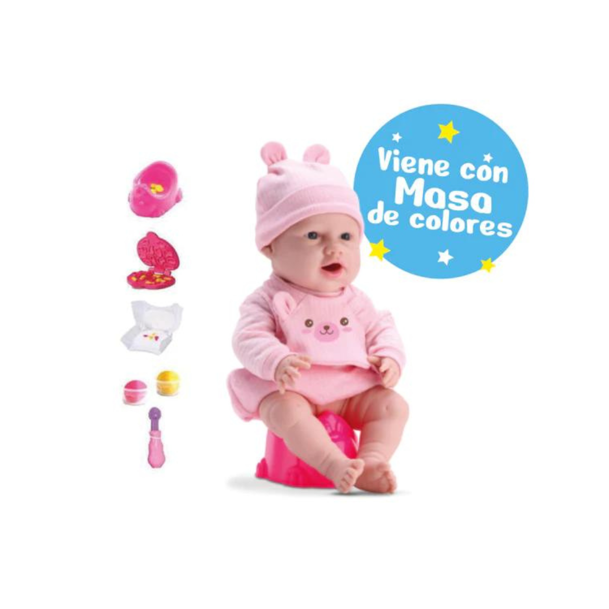Muñeca con accesorios. Plato con molde para hacer comiditas, cuchara, pelela, pañal y dos potes de masa de color. El bebé es de un material como goma, de alta resistencia.