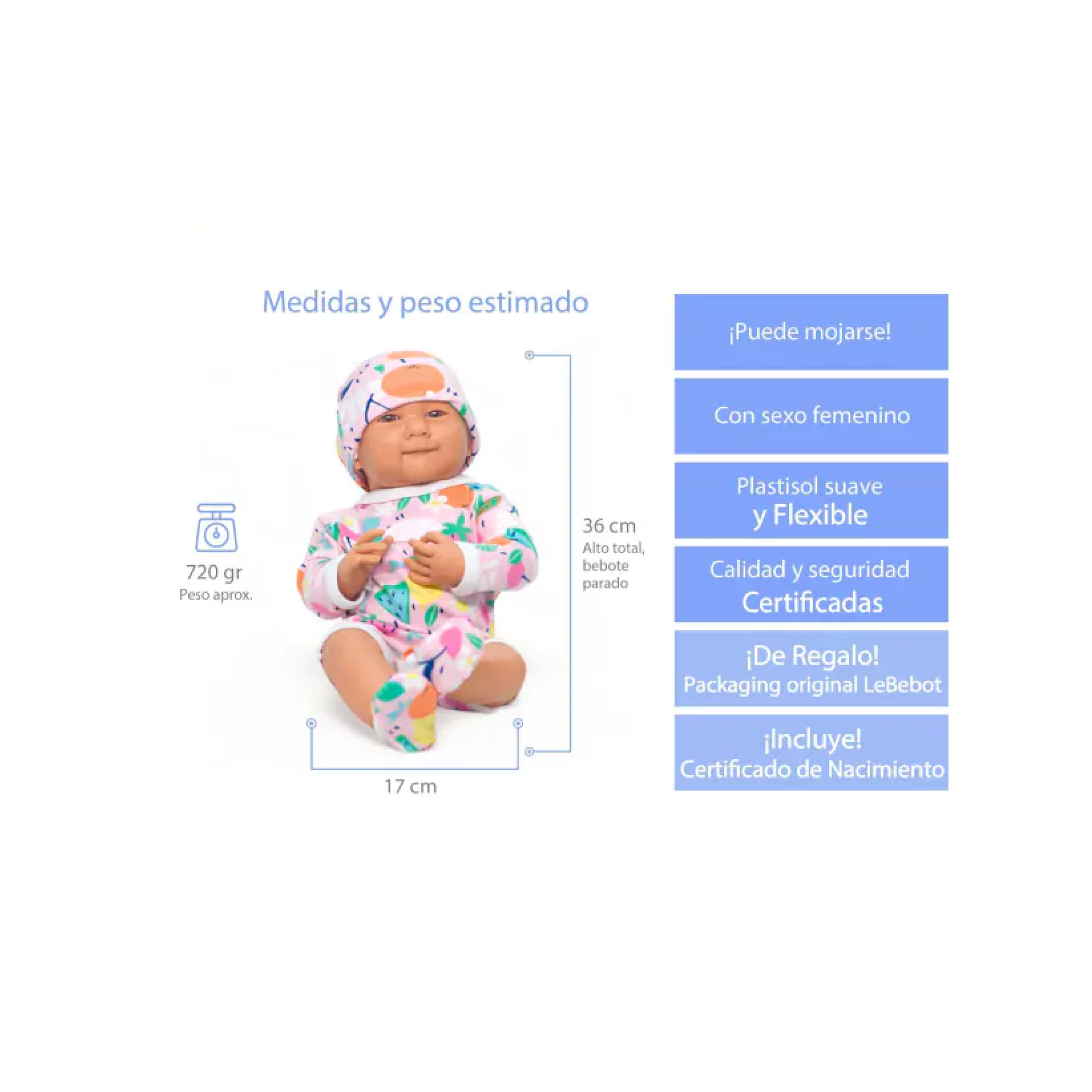 Incluye body manga larga, escarpines y gorro. La ropa es lavable. Viene con certificado de nacimiento.