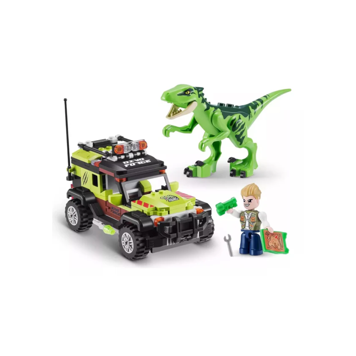 Se puede armar un vehículo de 15,5 cm y un dinosaurio. El huevo mide 24 cm. de alto.