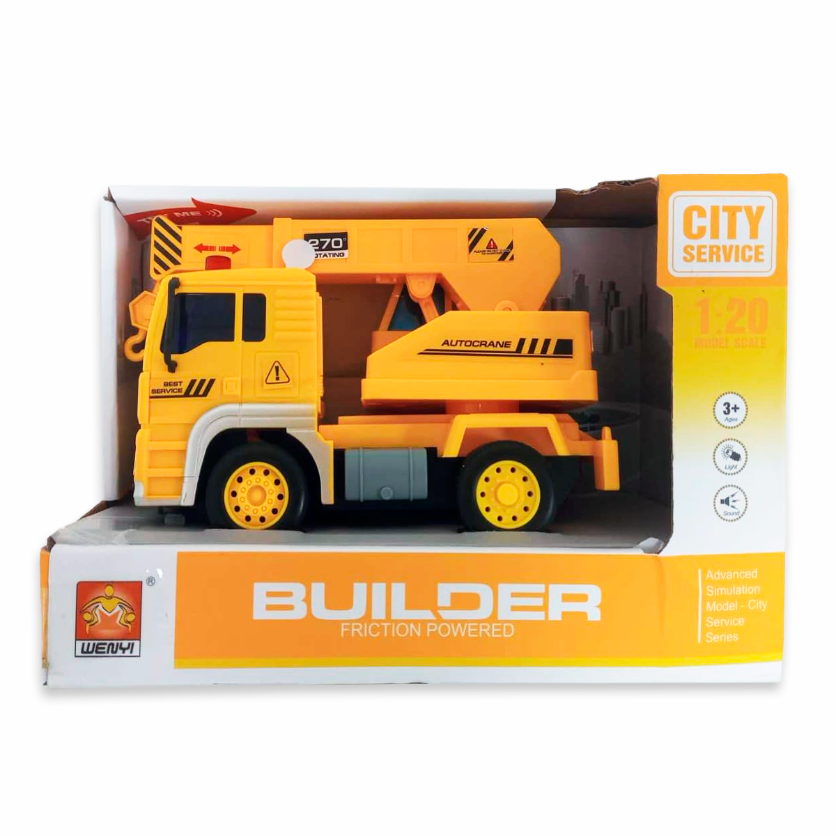 Camión Grúa a fricción con luz y sonido. Con mecanismo instalado, fácil de usar, simplemente empujar o tirar el camión Grúa. Posee 4 botones en el techo de la cabina con sonido de sirenas y bocinas.