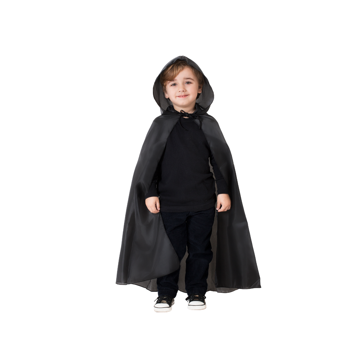 Capa negra para niños. Conformado por una capa de tela con tiras para atar en el cuello y una capucha.