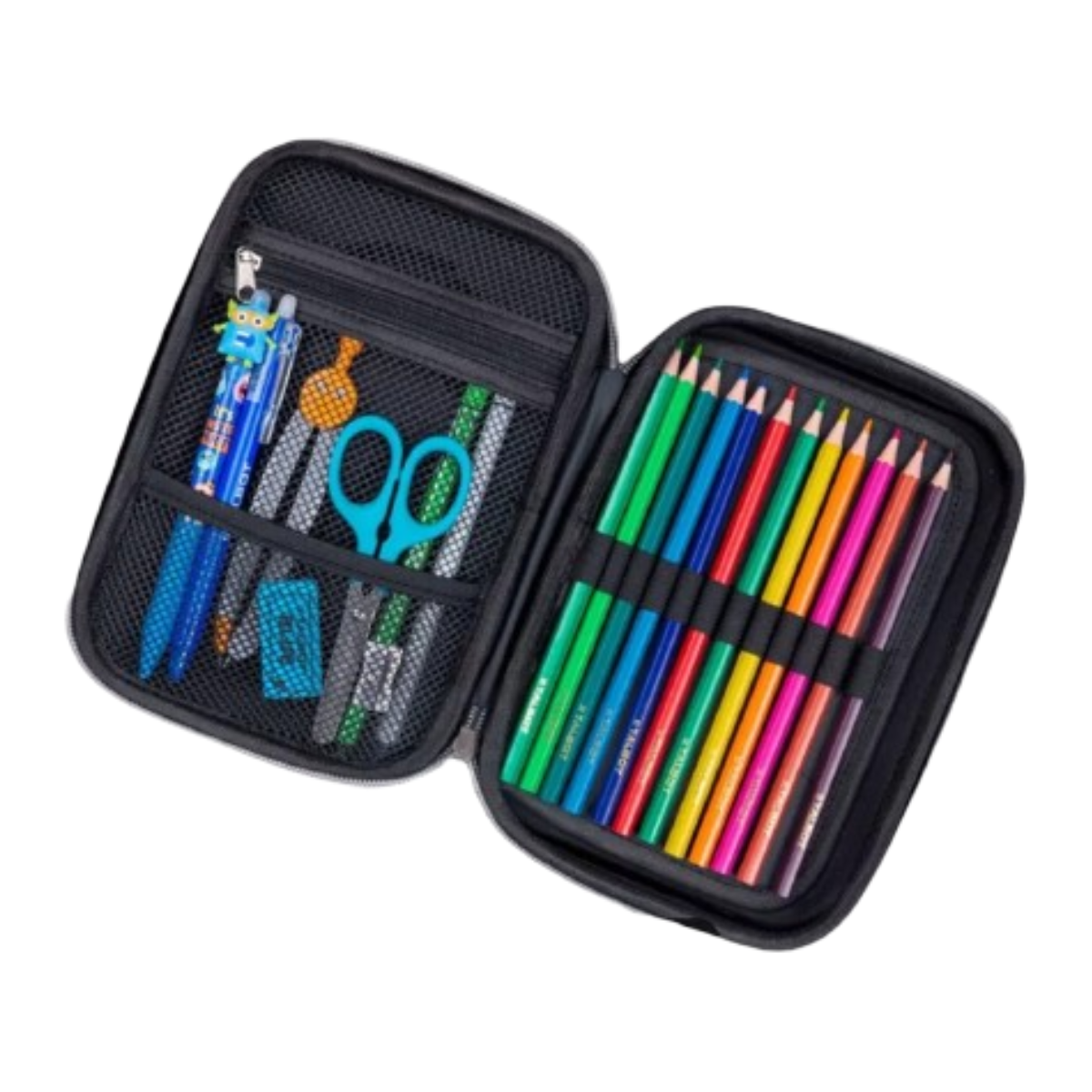 Incluye: 1 Cierre - Bandeja divisoria con elásticos porta lápices - 3 bolsillos - Medidas: 22 x 15 x 4,5 cm. - Peso: 190 g. - Capacidad: 1,5 L. - Capacidad en lapices: 45 Unidades - Medida abierta: 31,5 cm.