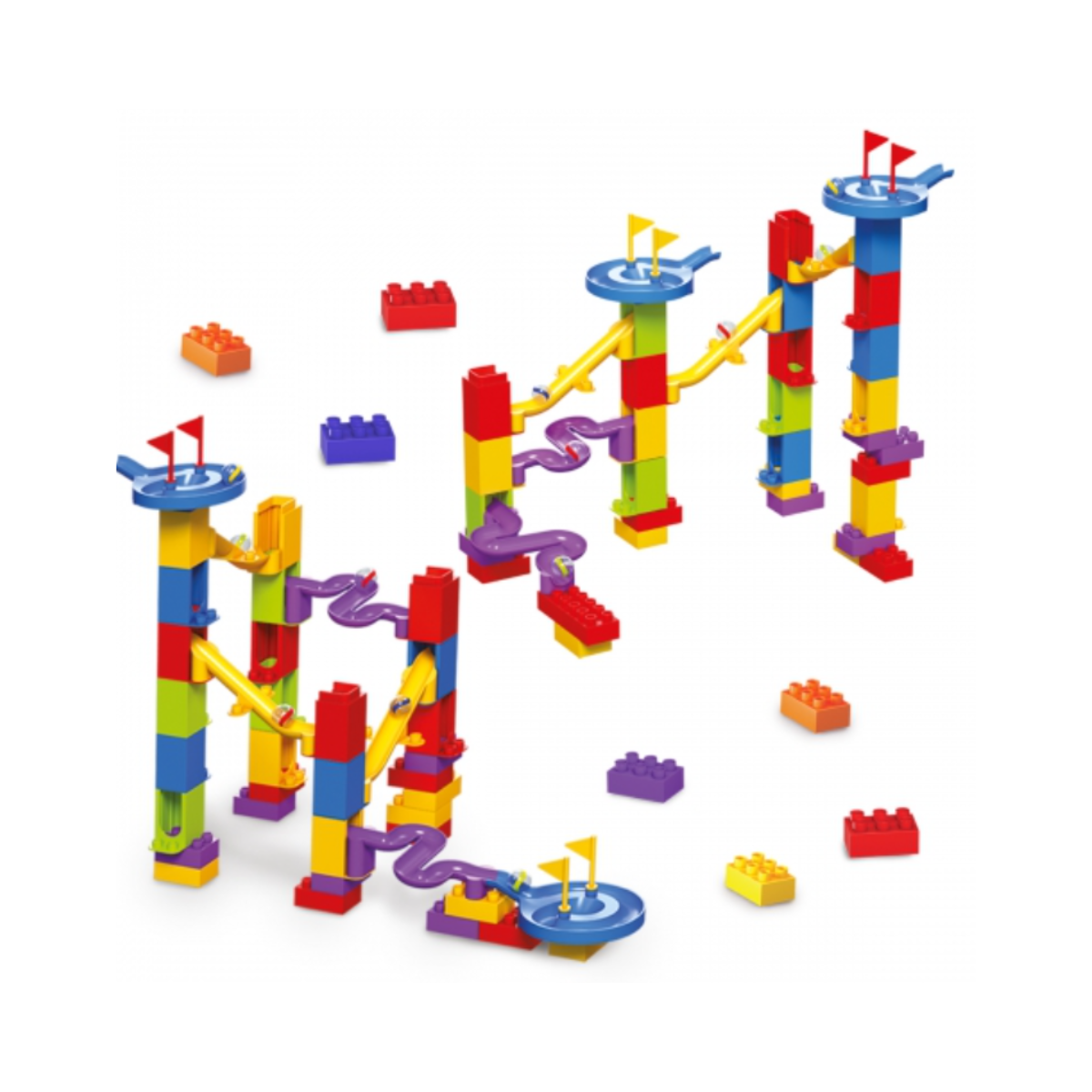 50 piezas: 17 tubos, 2 espirales, 2 zig zag, 3 toboganes, 17 bloques Blokoco, 5 bolitas y 4 banderines.