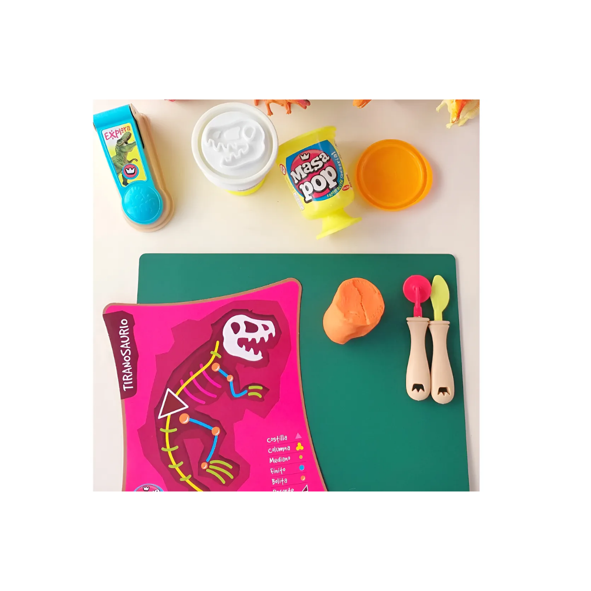 - Incluye masa de colores y moldes con formas de dinosaurios y fósiles