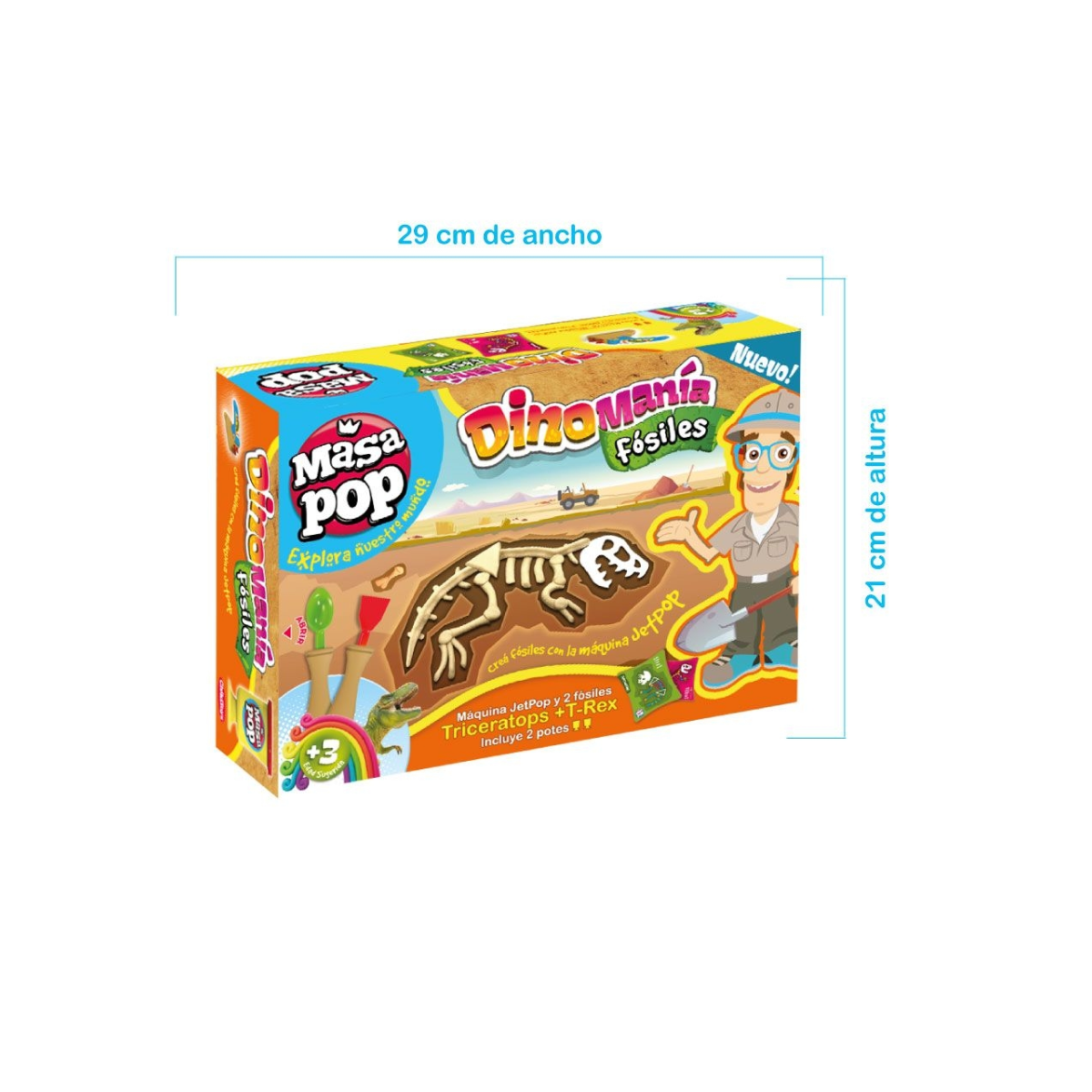 Contenido del producto: 2 potes de Masa Pop con 2 cortantes de cráneos, 1 máquina JetPop, 2 planos para armar fósiles Triceratops + T-Rex y 2 herramientas Popsticks.