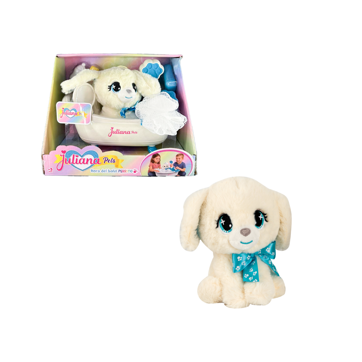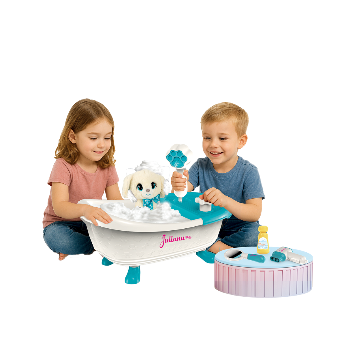 ¡Bañá y mimá a tu adorable mascota! El set Pets Hora del Baño Perrito de Juliana es un juguete interactivo que simula la rutina de cuidado de una mascota. El perrito se moja y se deja secar solo, y la diversión se maximiza gracias a la bañera que presiona y sale agua de verdad. El set incluye 10 piezas de accesorios para que los niños puedan bañar, peinar, mimar y jugar sin parar. Es ideal para fomentar el juego de rol, la empatía y la responsabilidad.