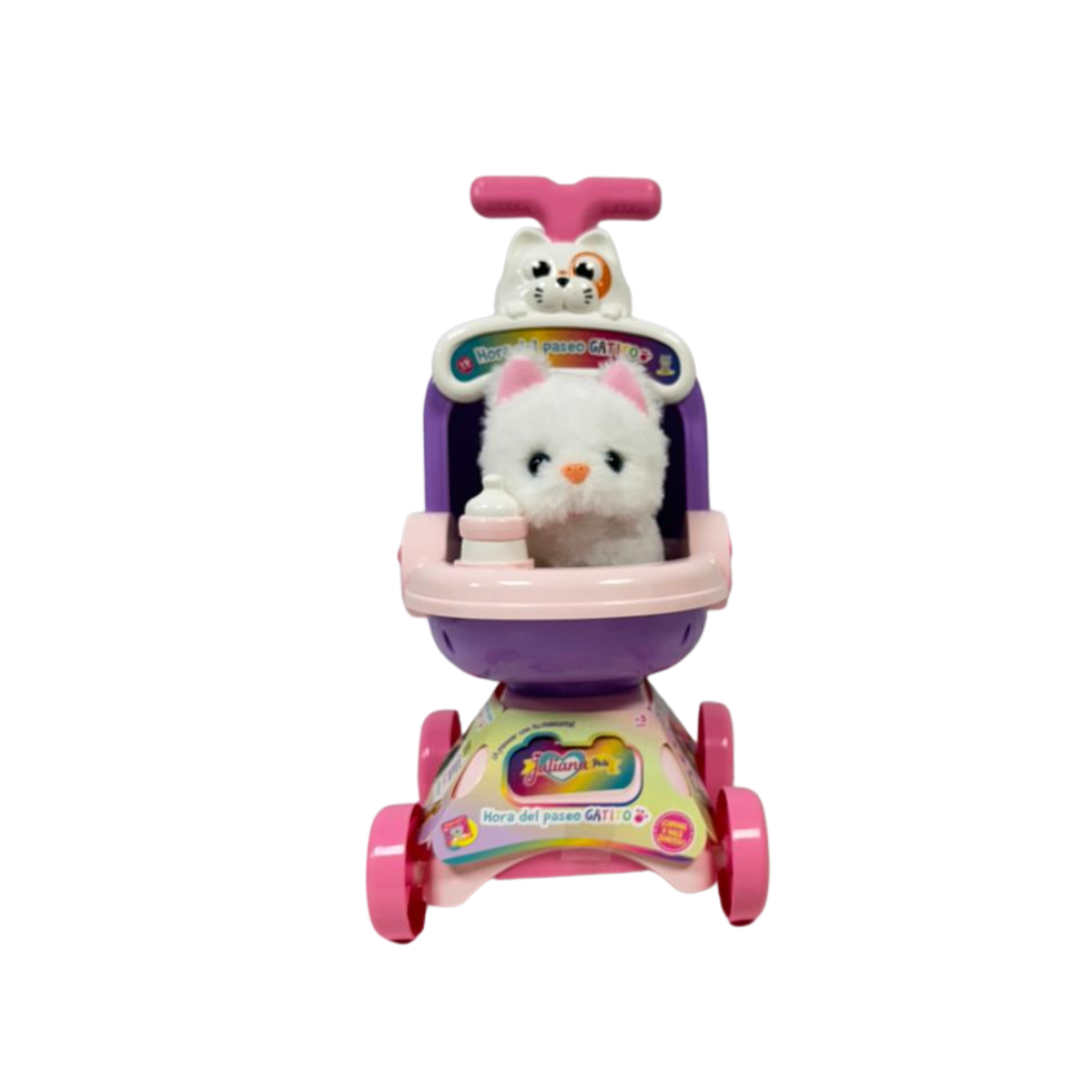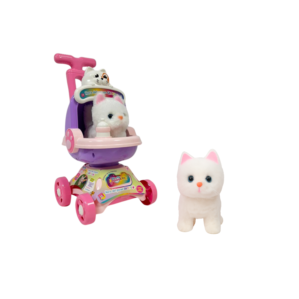 - Carrito transportador: El set incluye un práctico cochecito con ruedas para llevar al gatito a pasear.