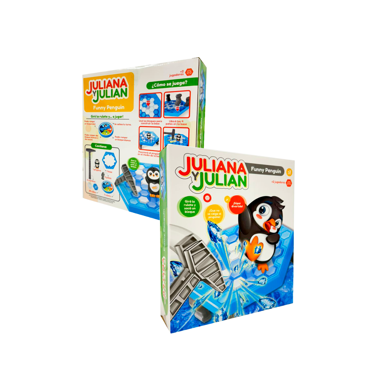 ¡El emocionante desafío de romper el hielo ha llegado! Funny Penguin Rompehielo de Juliana y Julián es un divertido juego de mesa donde la misión es simple: que el pingüino no se caiga. Los jugadores deben girar la ruleta para saber cuántos y qué bloques de "hielo" (blancos o azules) deben romper con los dos martillos incluidos. Es un juego ideal para desarrollar la concentración, la motricidad fina y la estrategia, mientras todos se divierten con este tierno pingüino. ¡Girás la ruleta y a jugar!