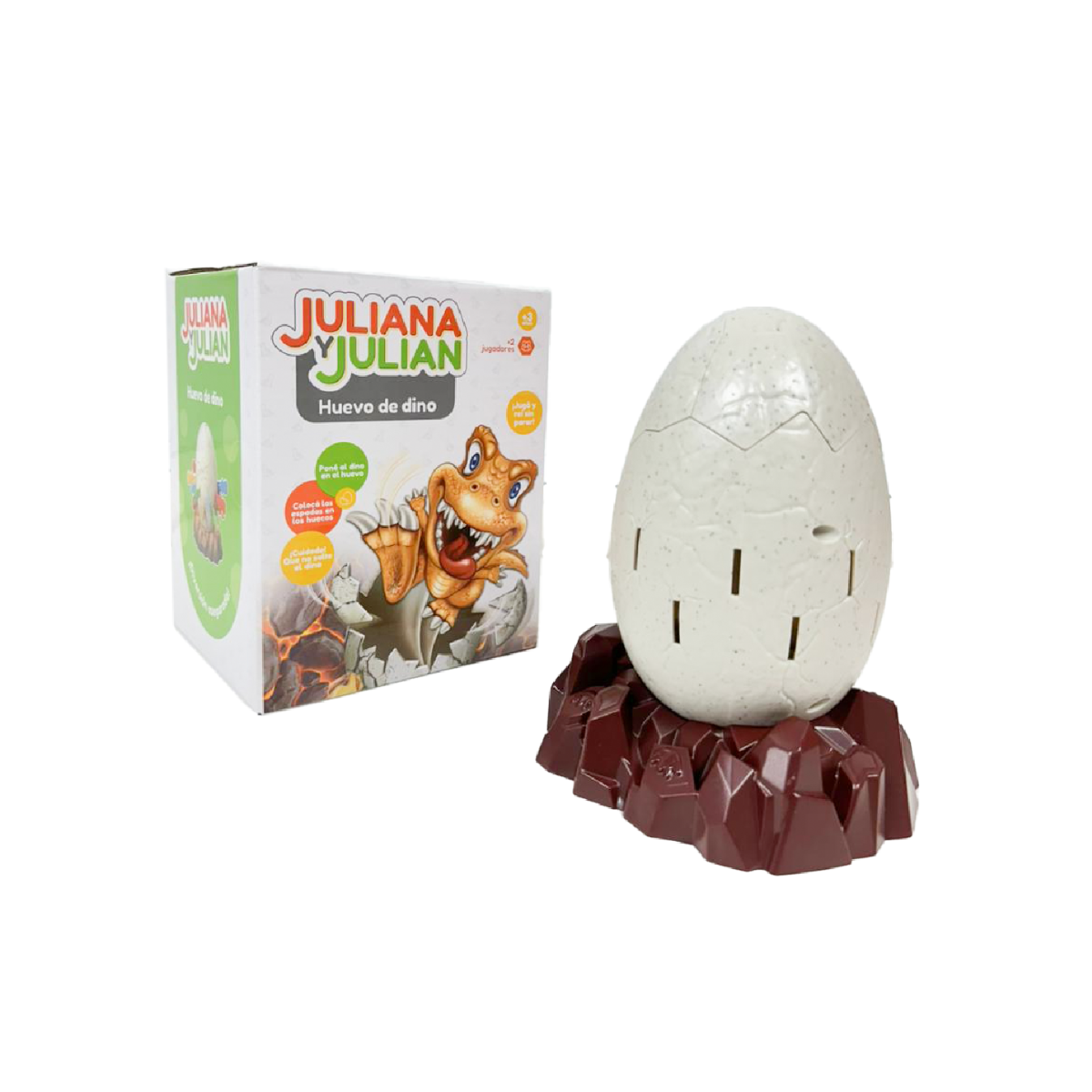 ¡Cuidado que no salte el dino! El Huevo de Dino de Juliana y Julián es un emocionante juego de acción que garantiza risas y diversión sin parar en familia. El objetivo es simple: el tierno dinosaurio se esconde dentro de la cáscara de huevo con un mecanismo de resorte. Por turnos, cada jugador debe insertar espadas en las ranuras de la cáscara. La tensión crece con cada turno, ya que si activás el mecanismo, ¡el dino saltará y ese jugador será el perdedor! Ideal para disfrutar de partidas rápidas y llenas de suspenso.