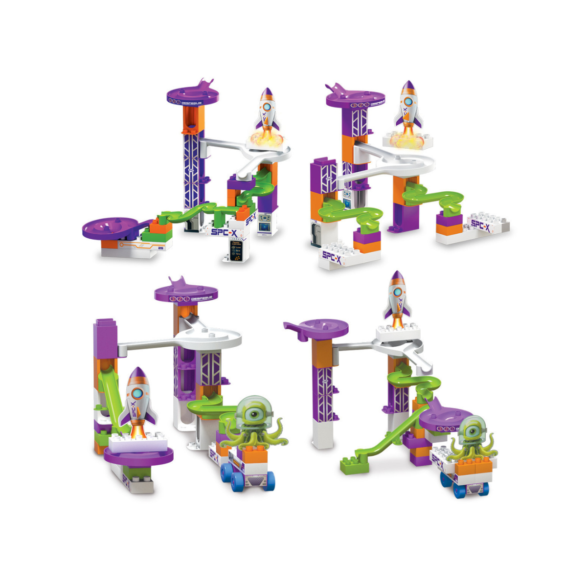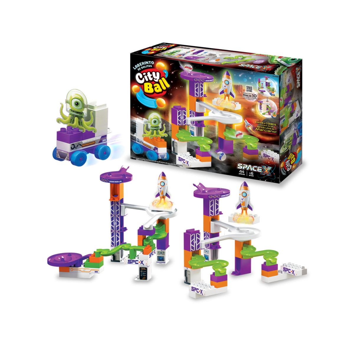 Incluye: 42 piezas: 10 tubos, 2 espirales, 1 tobogán, 2 zig zag, 1 banderín, 1 espiral doble dirección, 22 bloques Blokoco, 1 marciano y nave espacial de cartón y 3 bolitas. Además incluye stickers.