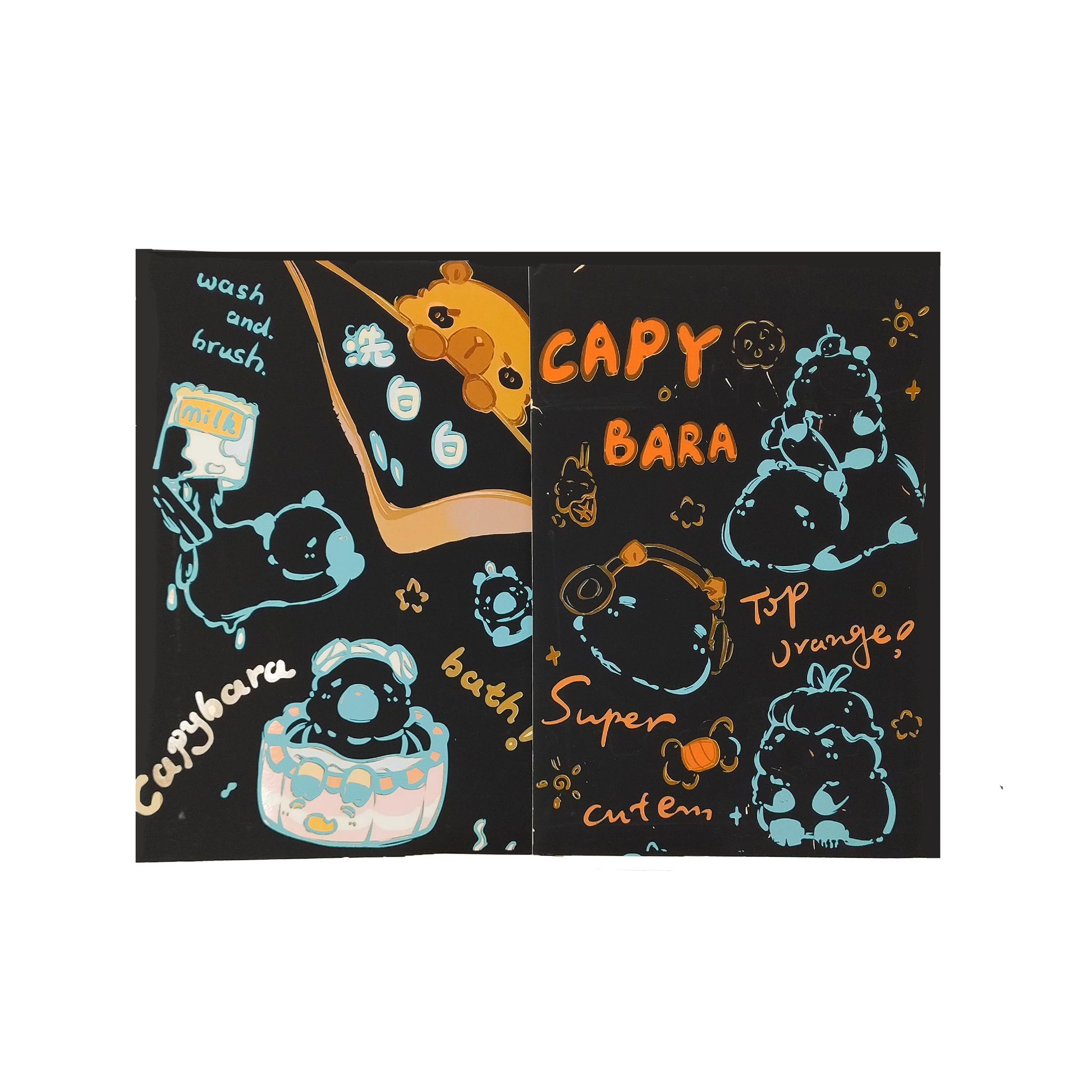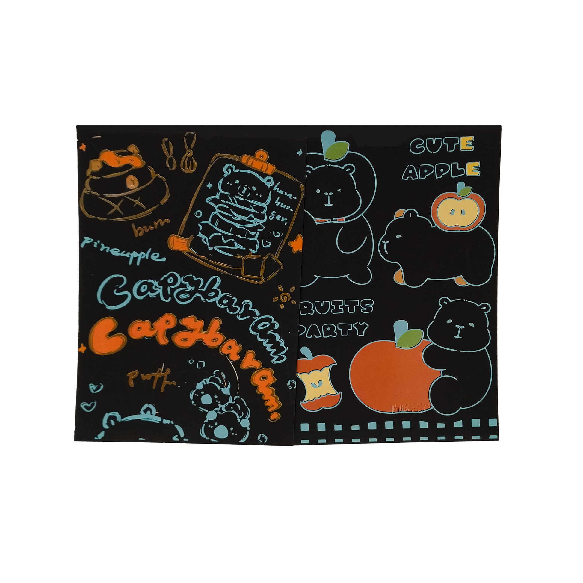 Incluye un set de 2 láminas con un lápiz de madera. Raspando con el lápiz se revelan imágenes sorpresa.