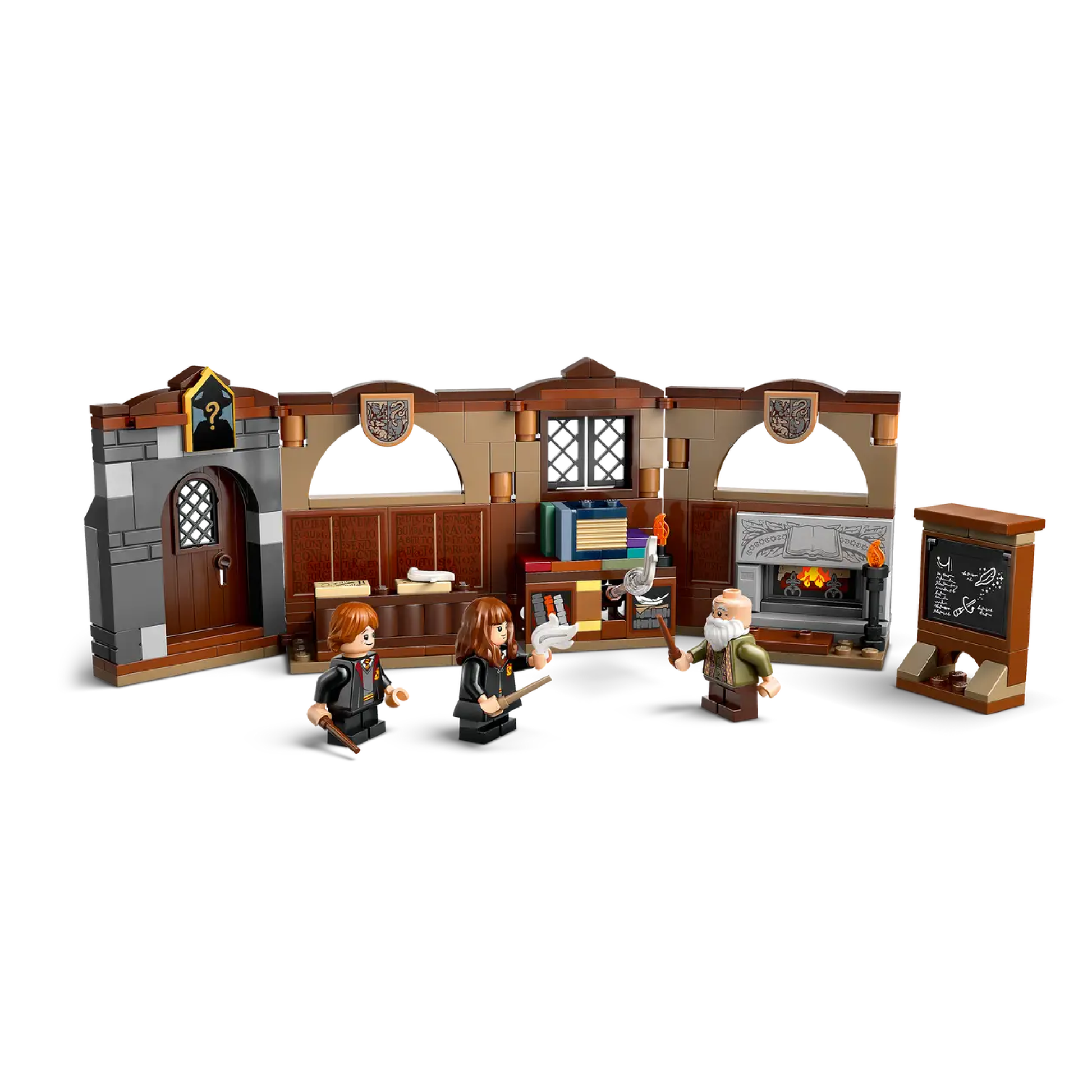 Contiene 204 piezas. El aula de Hogwarts se despliega e incluye una función de encantamiento Wingardium Leviosa para hacer levitar una pluma, pupitres desmontables, una pizarra desmontable y más. Incluye personajes Lego Harry Potter: Ron Weasley, Hermione Granger y el Profesor Flitwick.
