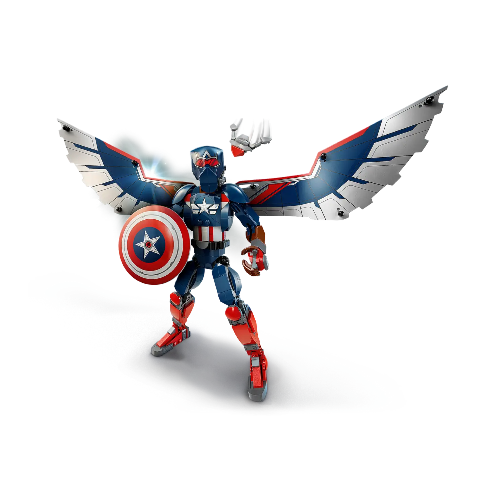 Contiene 359 piezas. Figura articulada: las uniones móviles en hombros, brazos, caderas y piernas permiten colocar al Capitán América en posturas de acción realistas, incluye escudo y tiene un dron Redwing construible conectado a la espalda.