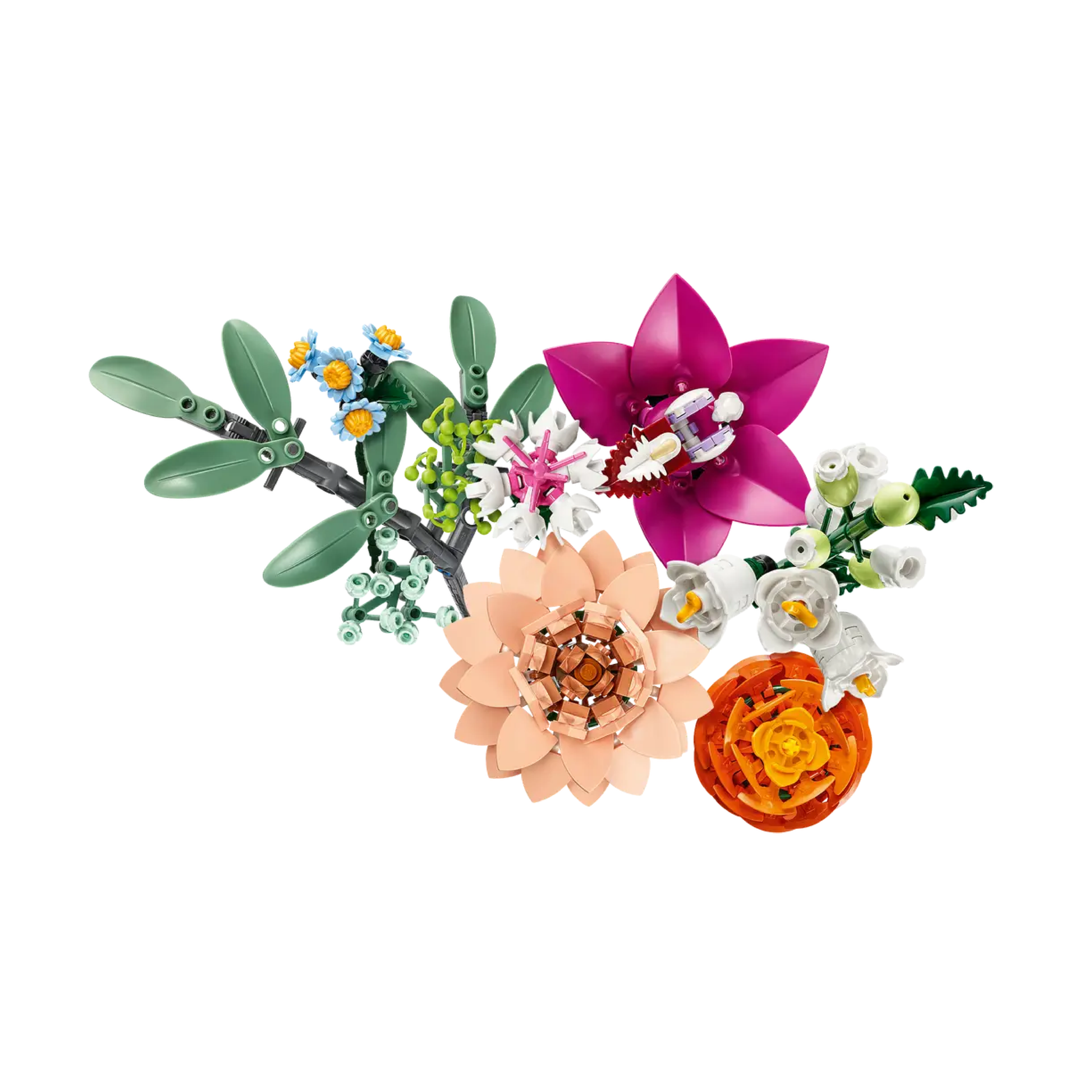 Contiene 749 piezas. El set está formado por 15 flores construibles con tallo (margaritas, acianos, eucalipto, flores de saúco, rosas, ranúnculos, orquídeas barco, una campanilla y una dalia nenúfar)