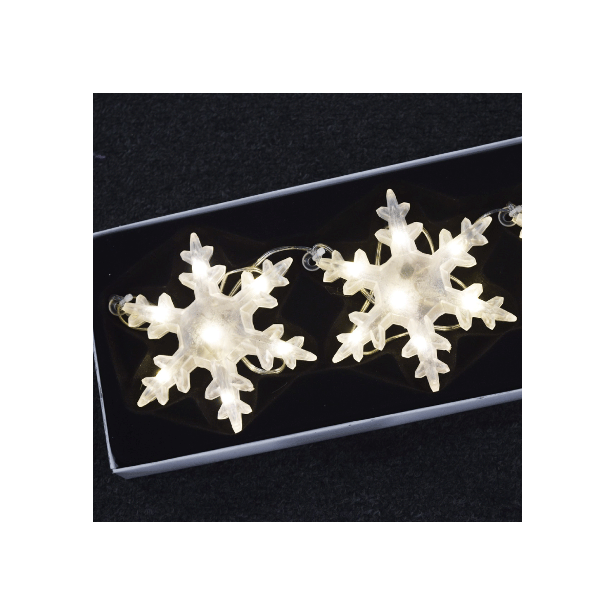 Tira de luces LED con 3 figuras plásticas de copo de nieve transparentes y 1,4 m de cable transparente. Funciona con 3 pilas AA, no incluidas, que permite ubicar las luces en cualquier lugar sin depender de un enchufe.