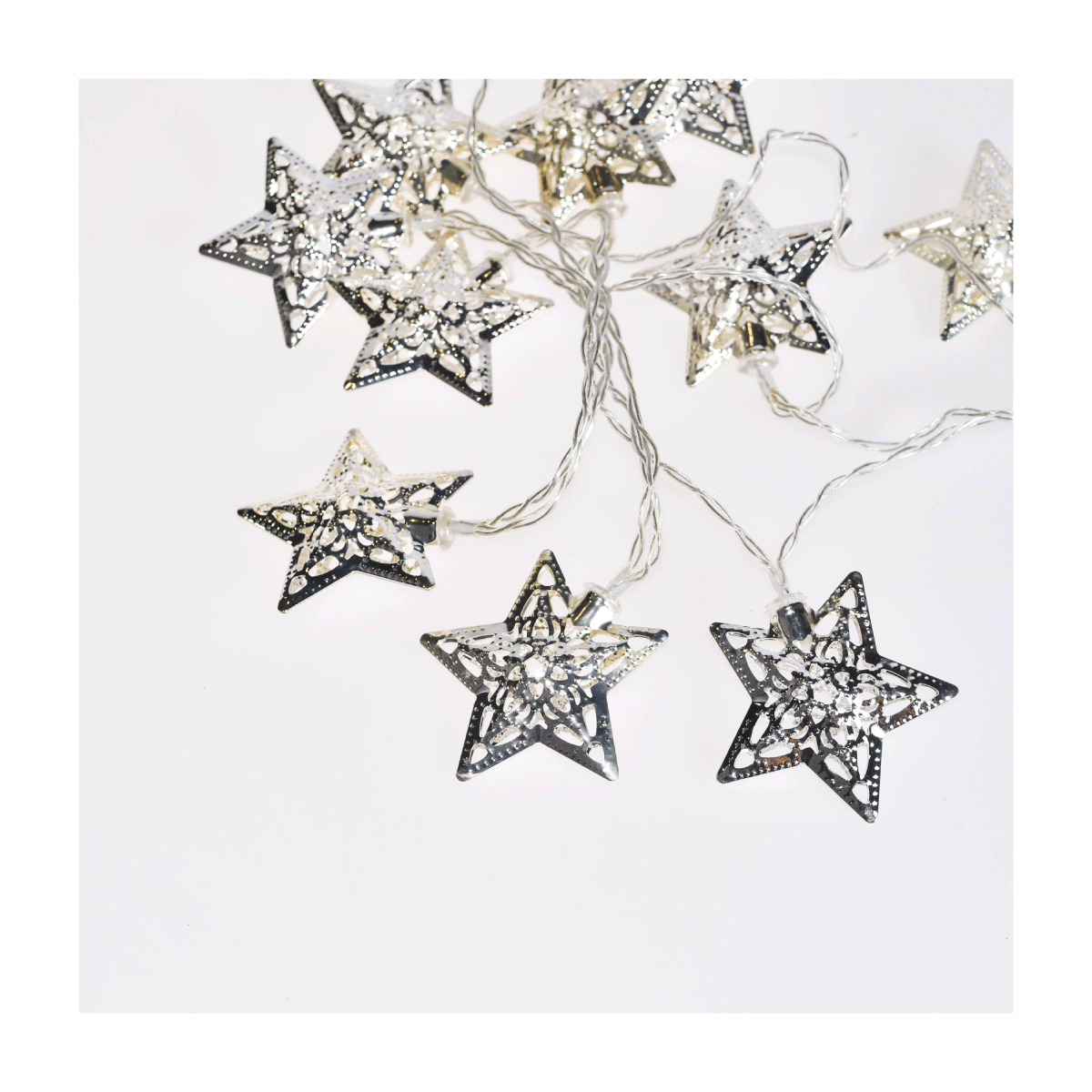 Una tira de 10 luces LED con estrellas metálicas plateadas de 4 cm de diámetro. Funciona con 2 pilas AA, no incluidas. Embalada en caja de acetato.