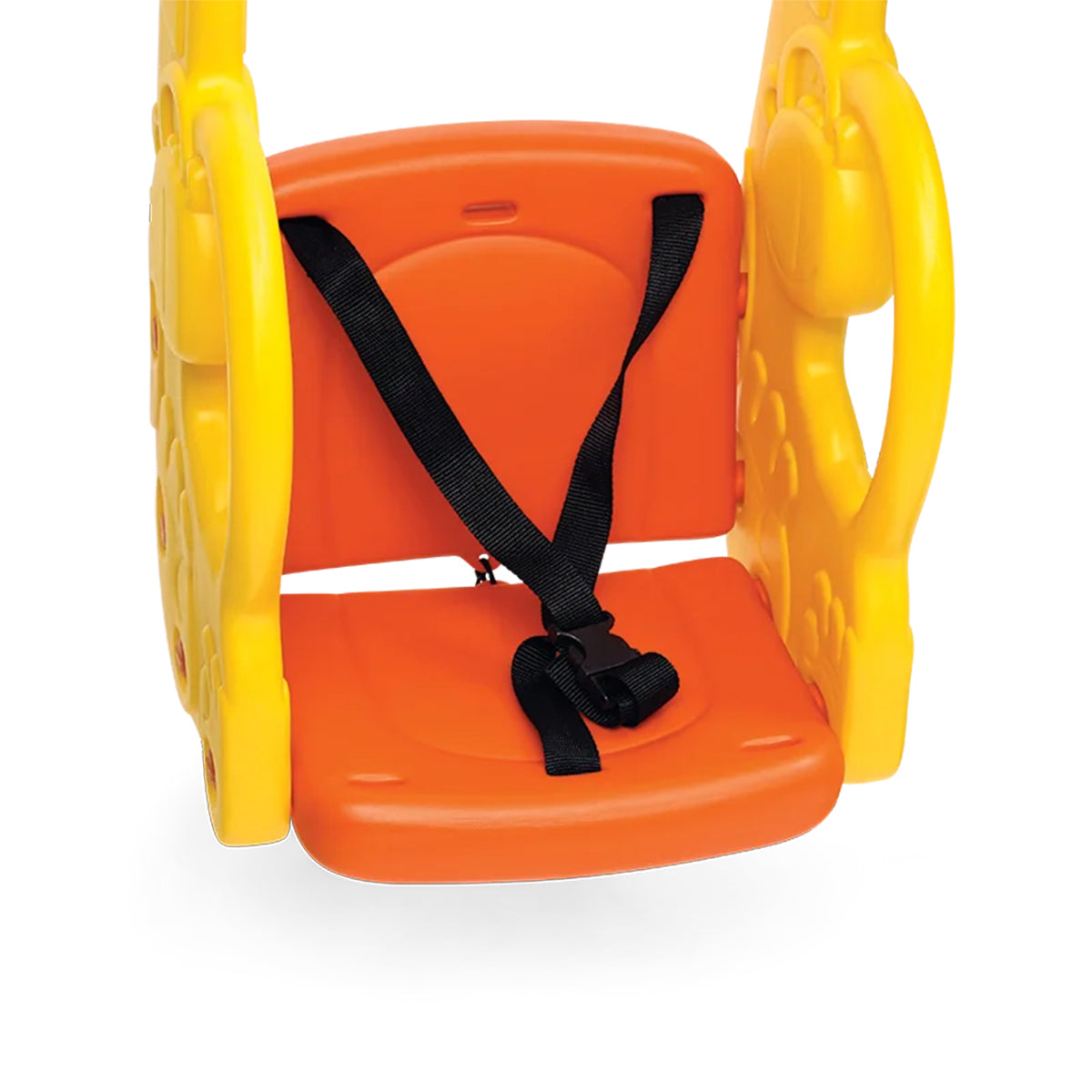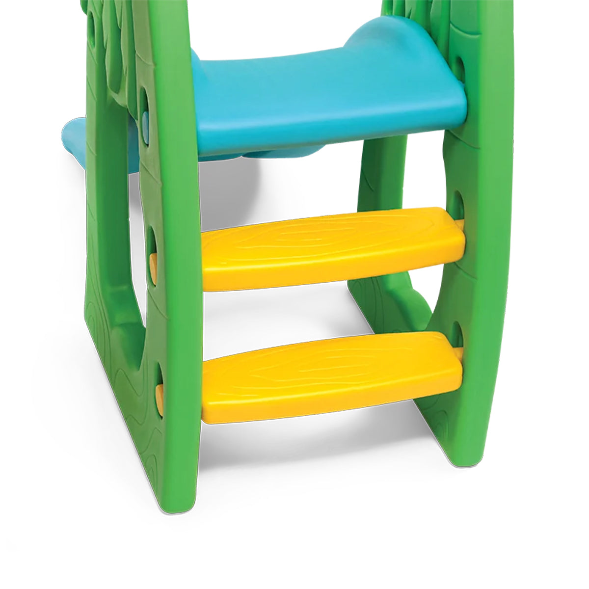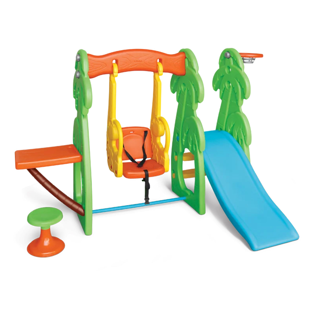 • Incluye tobogán, mesita de apoyo y banquito, hamaca con cinto de seguridad, aro de básquet con 2 alturas.