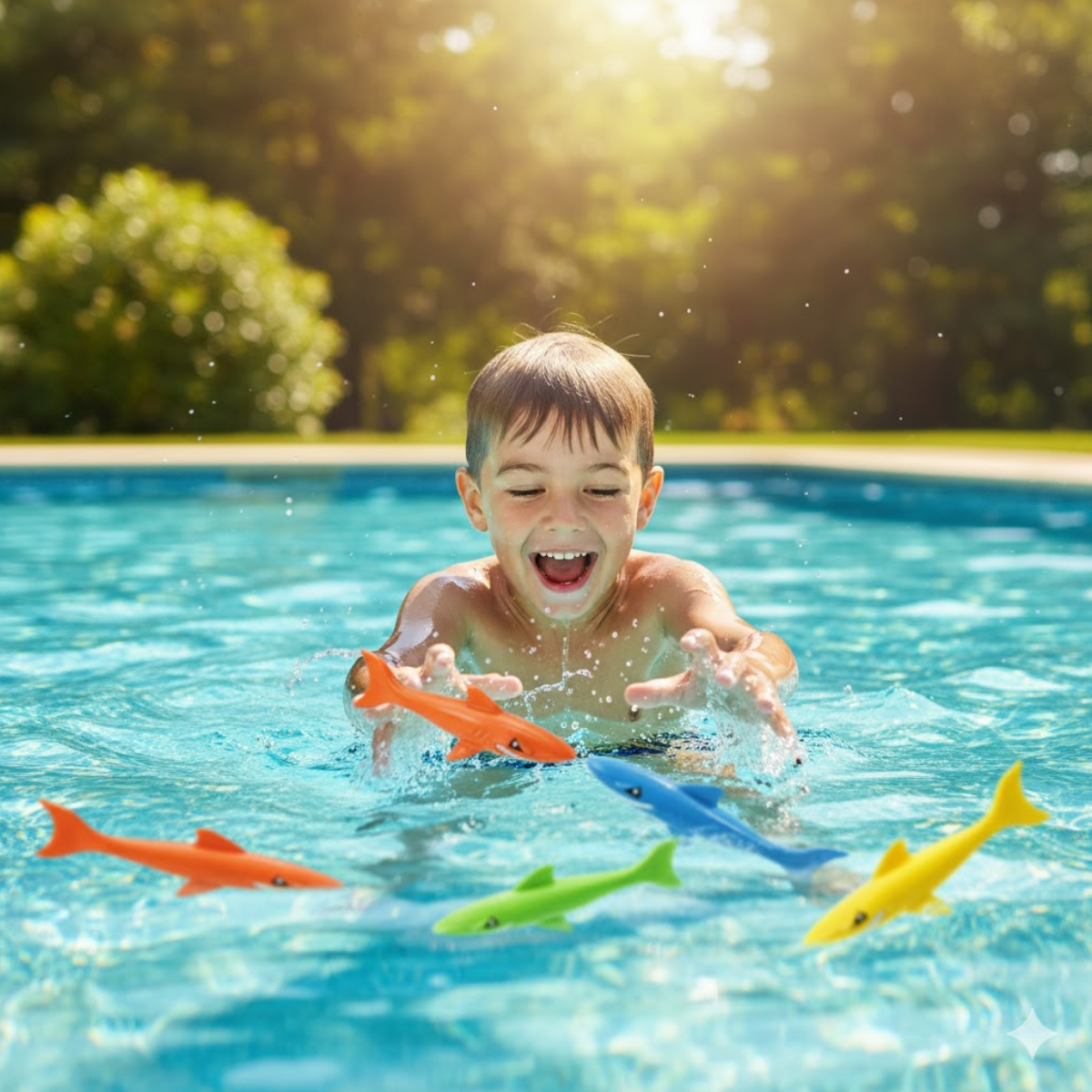 Este set de cuatro tiburones de buceo es perfecto para juegos en la piscina y para practicar habilidades de buceo. Los tiburones se hunden para que los niños puedan buscarlos bajo el agua.