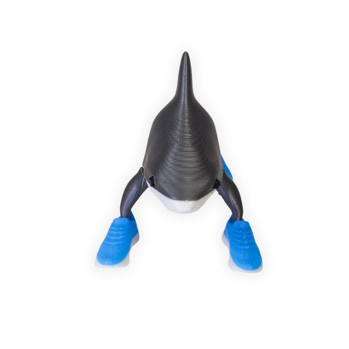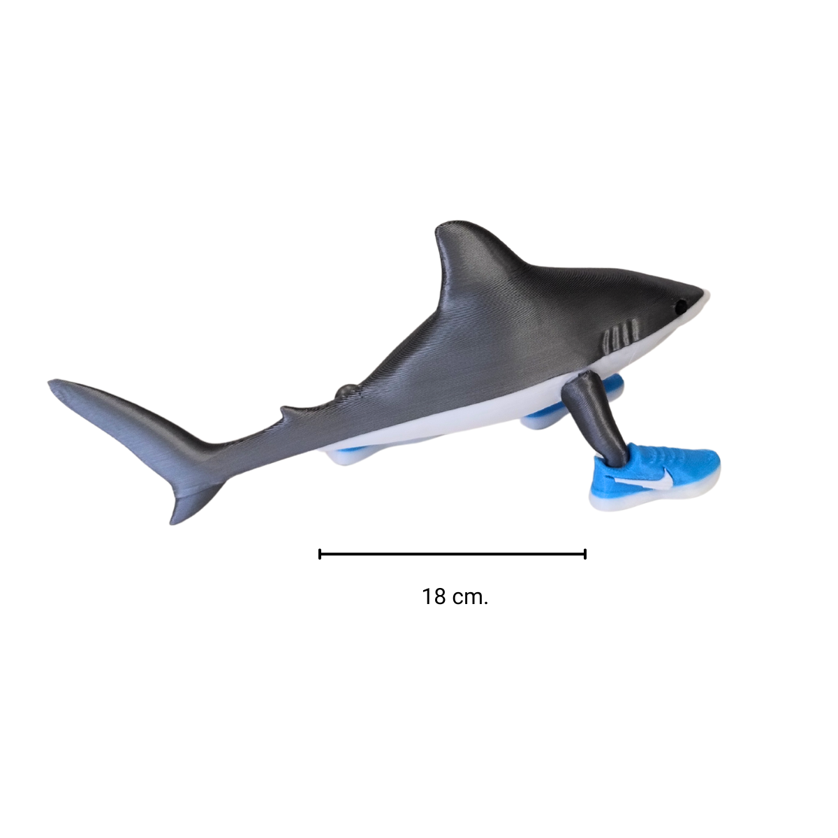 Con un diseño fiel al personaje: un tiburón con patas humanas y zapatillas