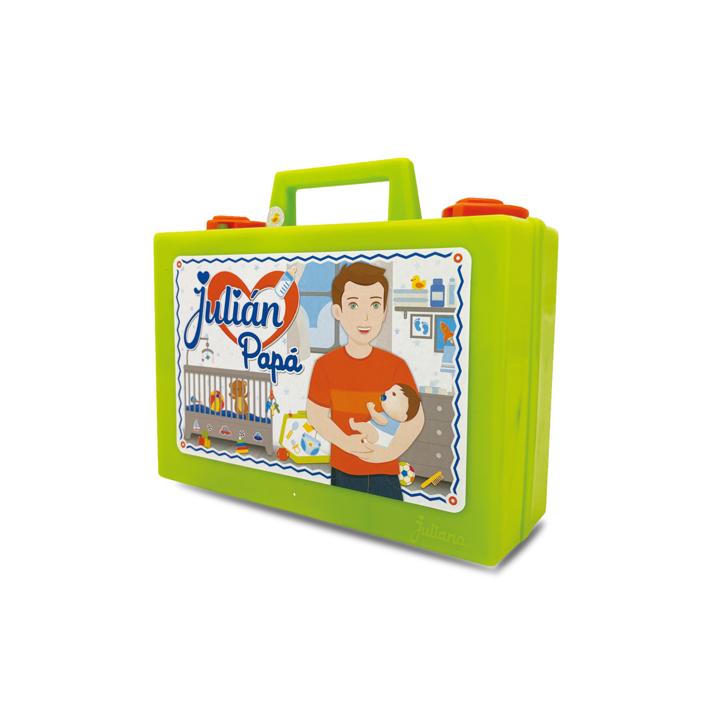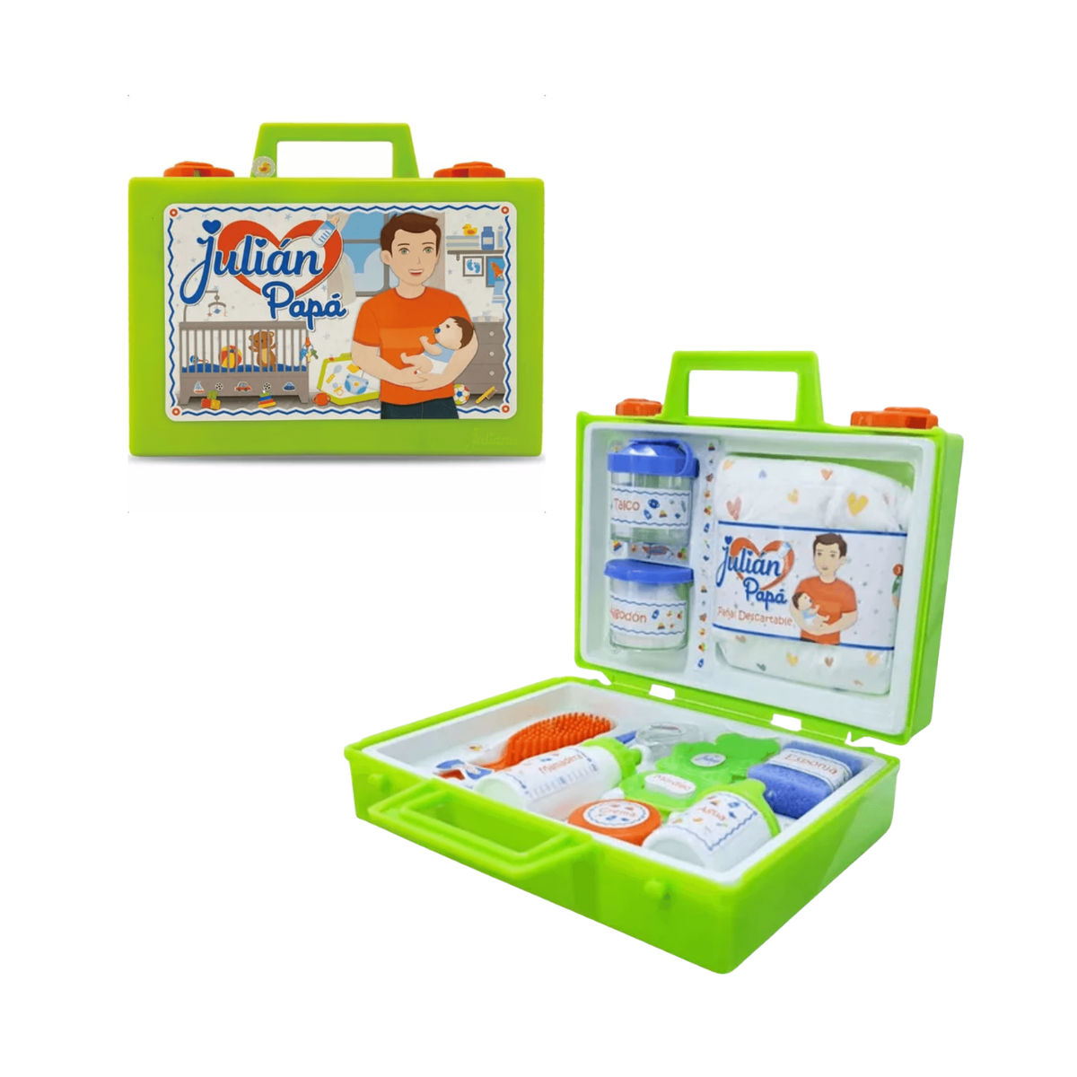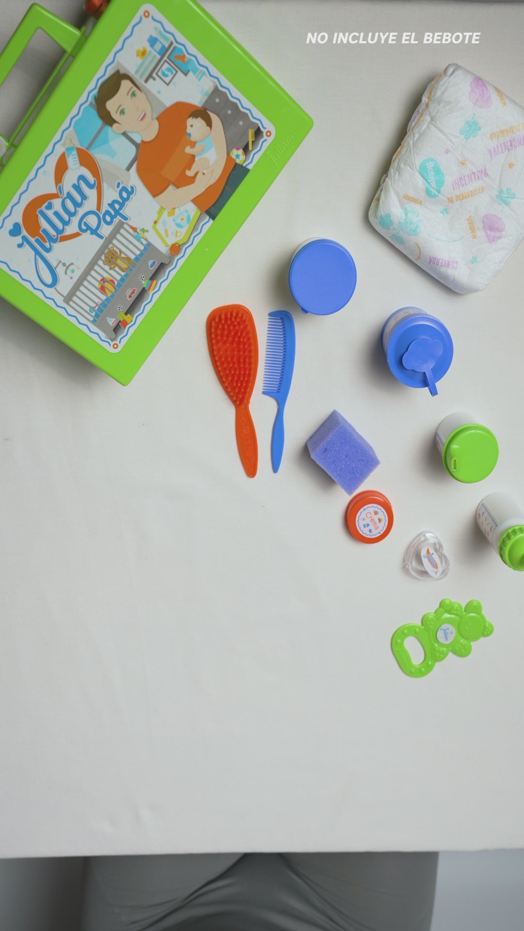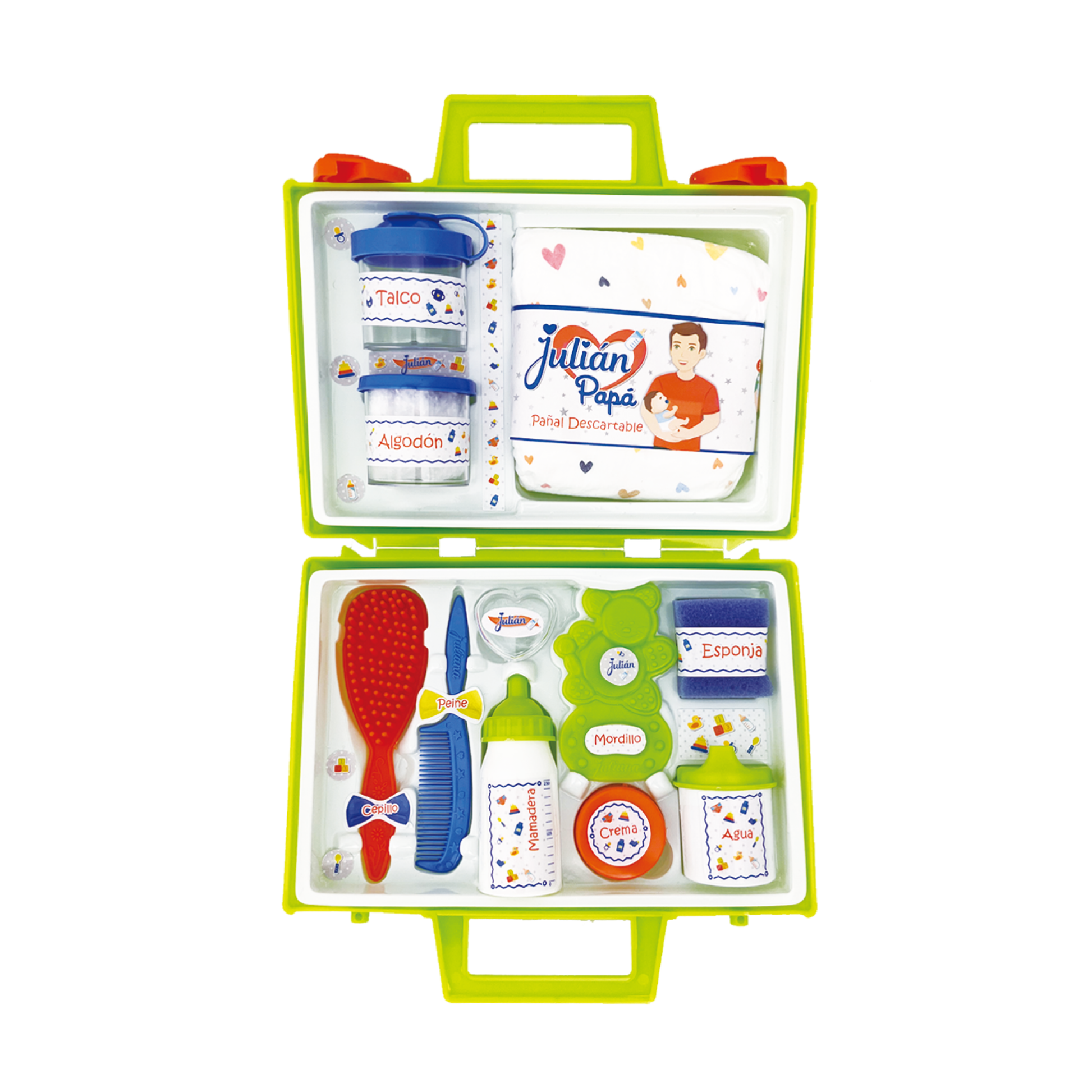 Incluye: Pañal, mamadera, peine, cepillo, mordillo, biberón de agua, esponja y recipientes de algodón, talco y crema.