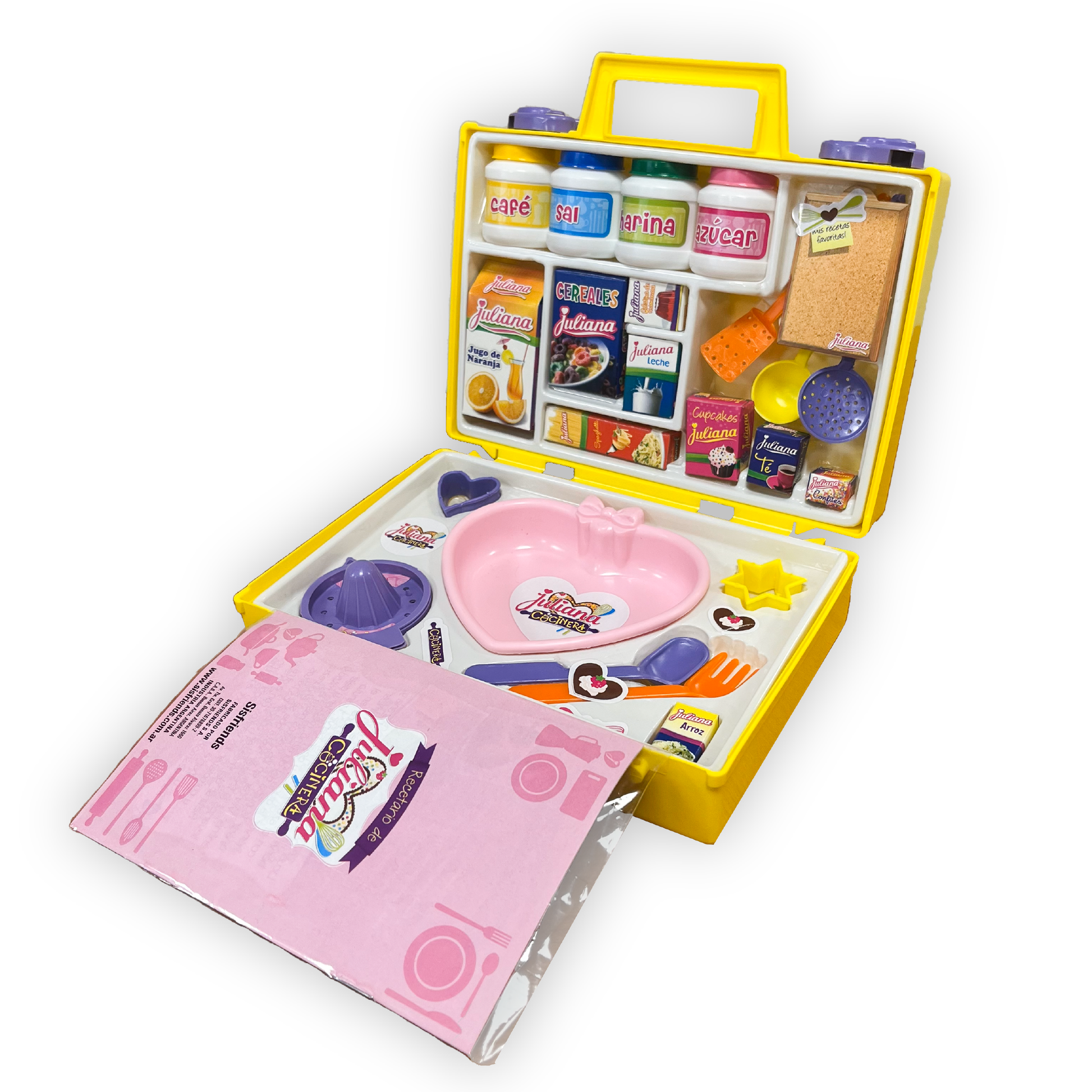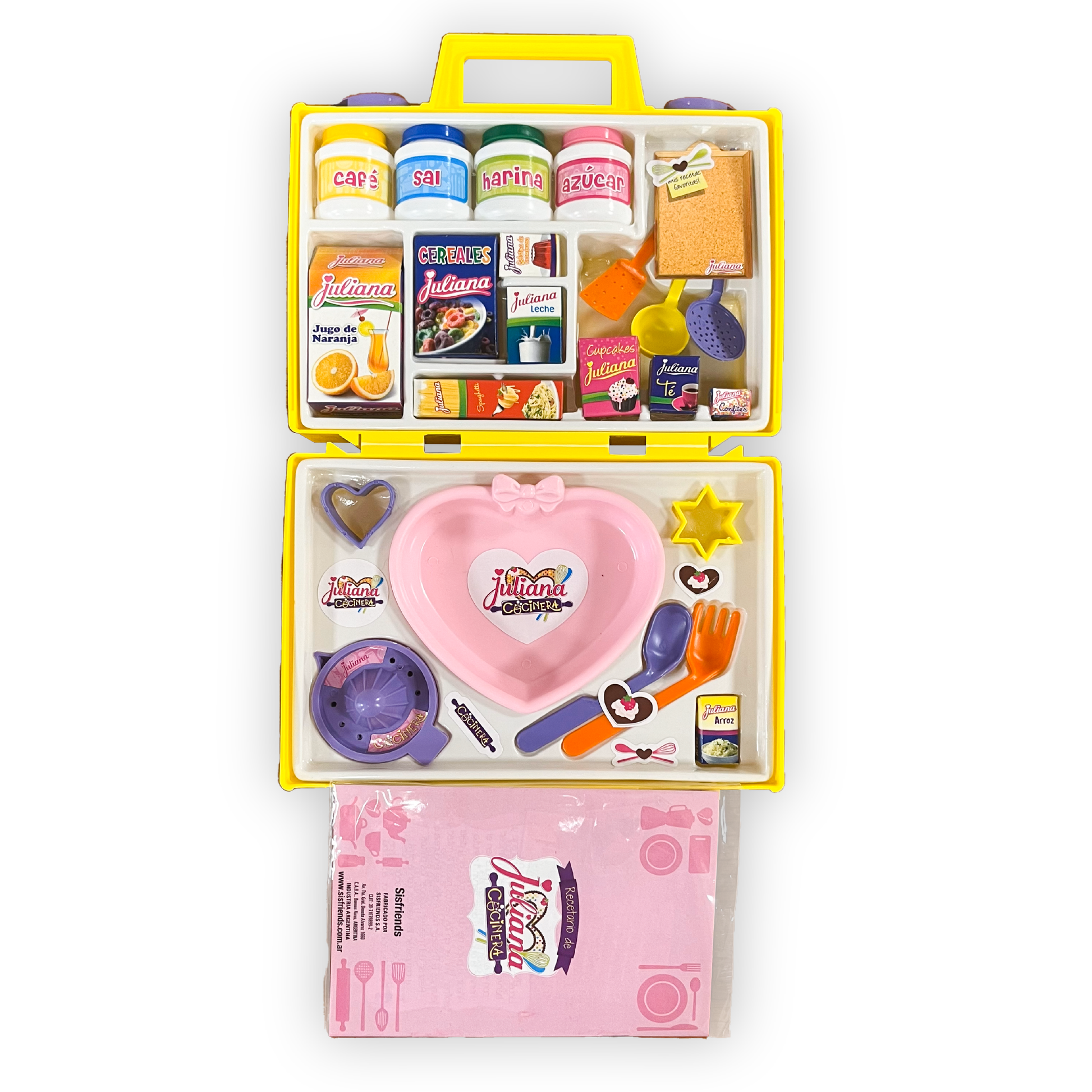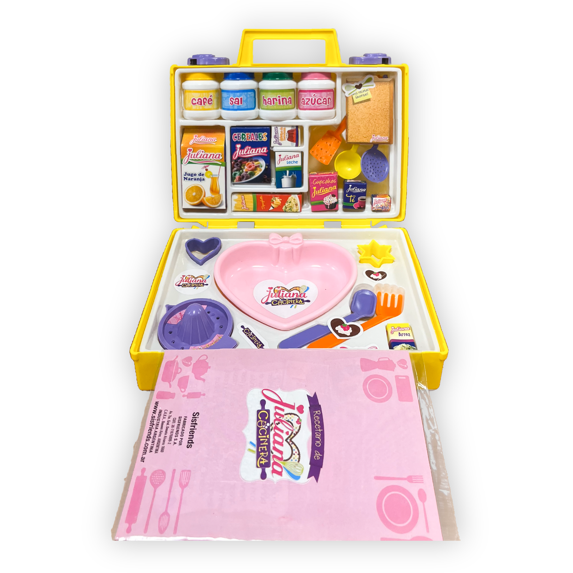 Incluye: Libro de recetas, platito, cubiertos, cortantes para galletitas, exprimidor de jugo, utensilios, alimentos varios, recipientes de sal, harina, café y azúcar.
