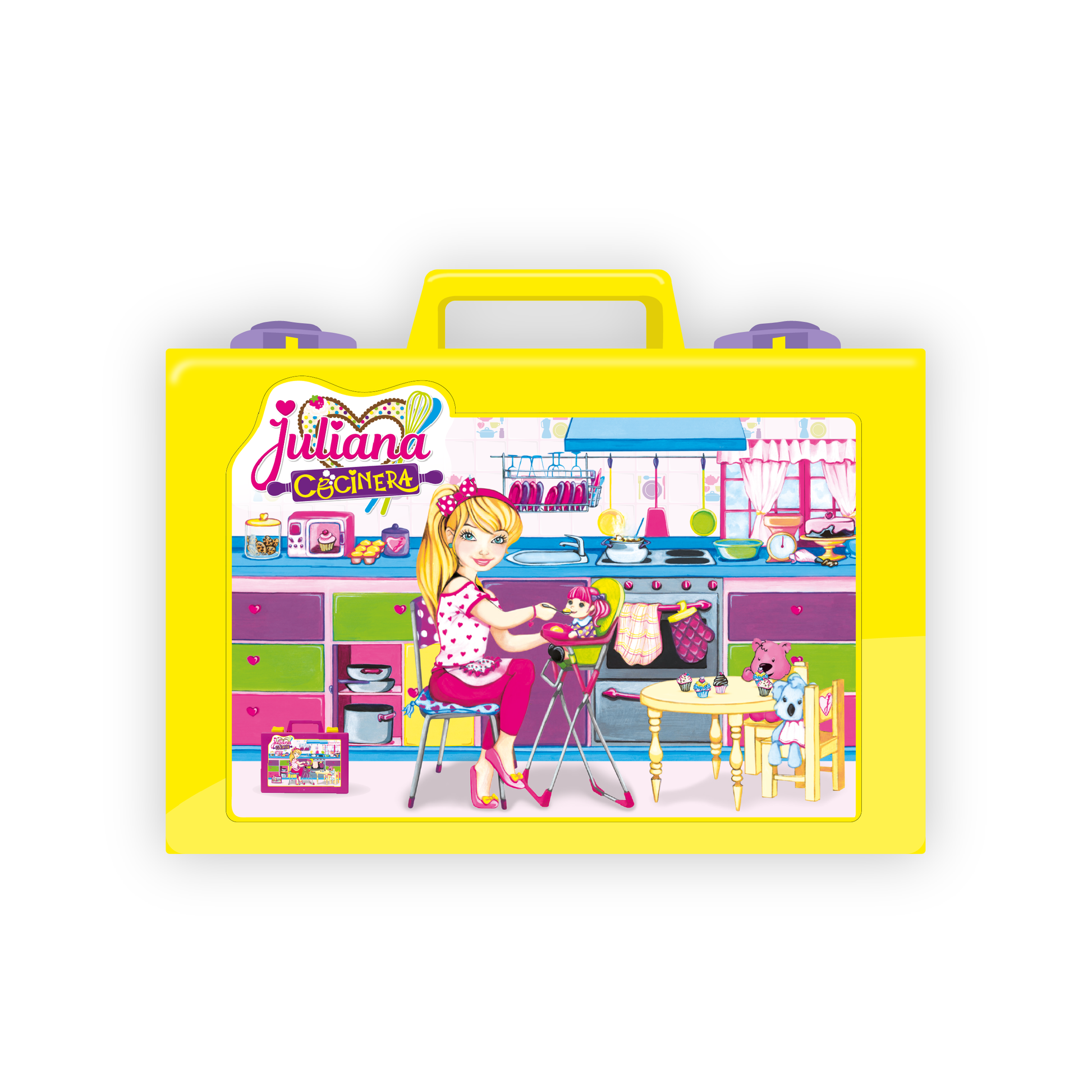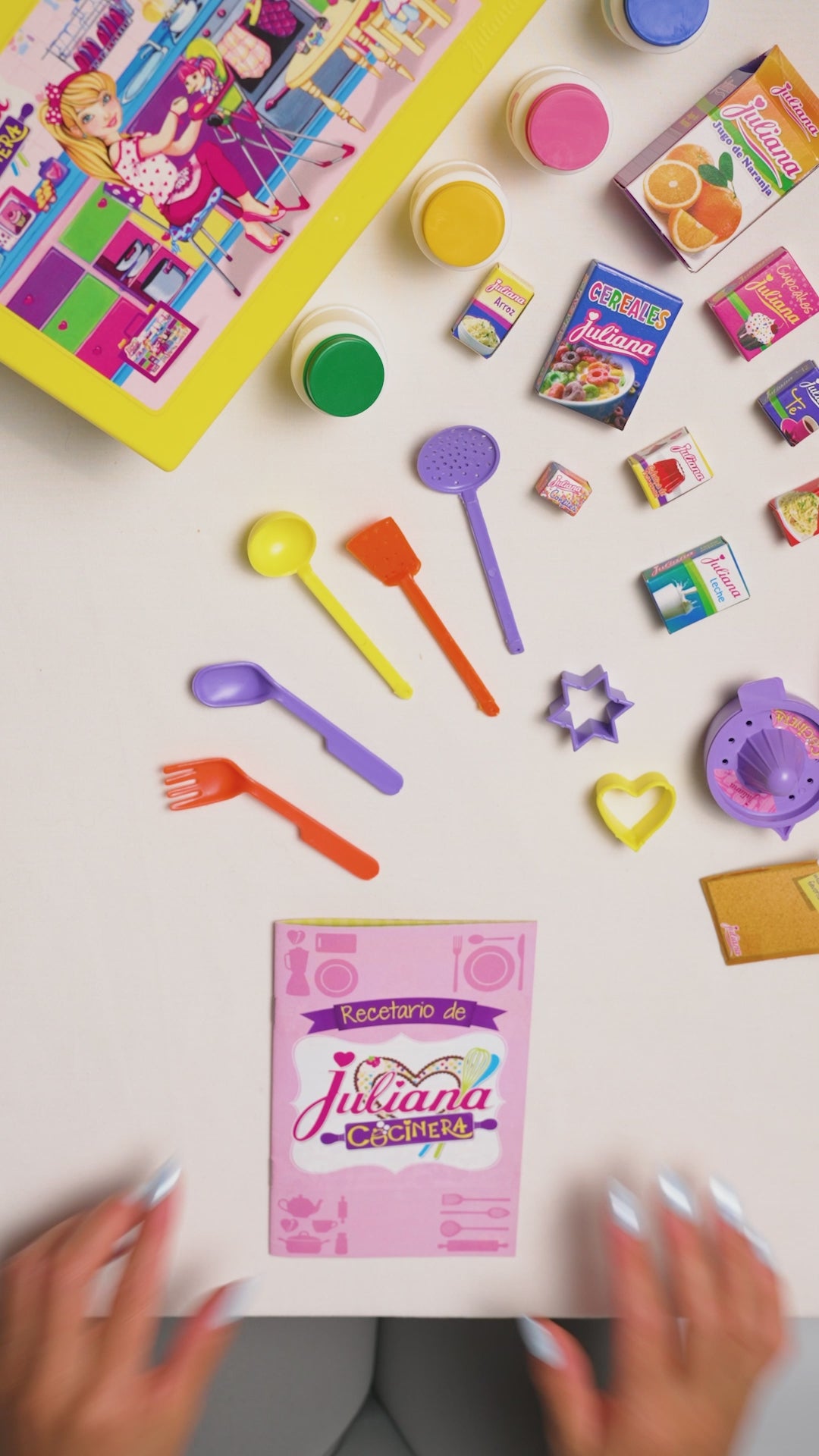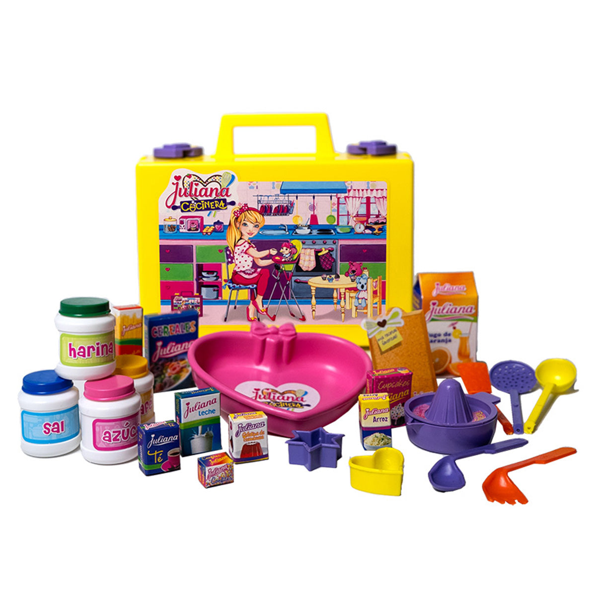 Incluye: Libro de recetas, platito, cubiertos, cortantes para galletitas, exprimidor de jugo, utensilios, alimentos varios, recipientes de sal, harina, café y azúcar.