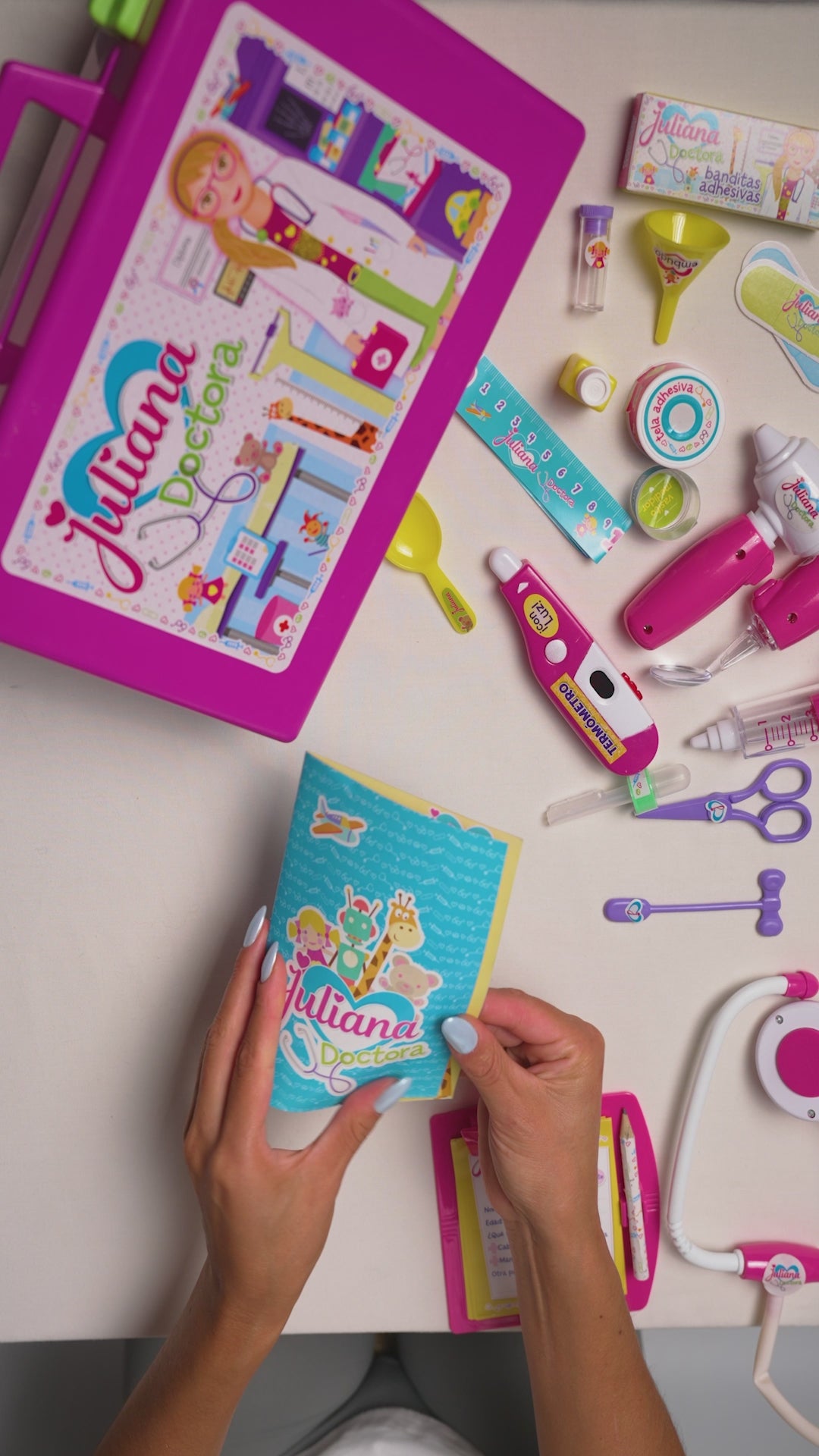 Incluye: Estetoscopio, otoscopio, bajalengua, jeringa, termómetro, banditas, tijera, cinta, ficha de paciente y un librito para ayudarte a ser la mejor doctora del mundo!