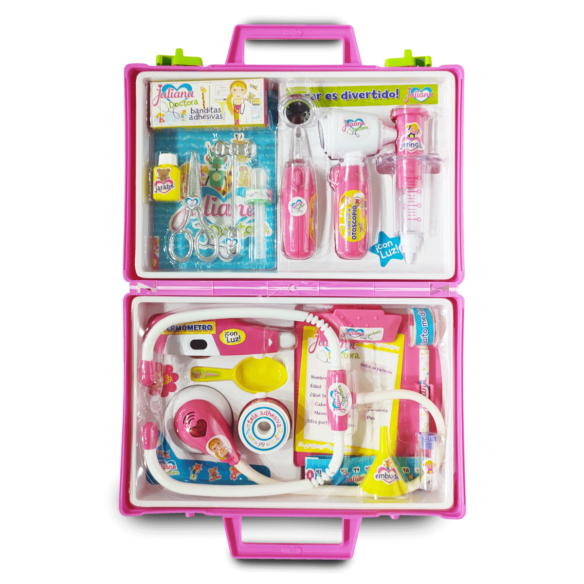 Set completísimo para jugar a ser doctoras. Trae instrumentos con luz para que la diversión sea única!