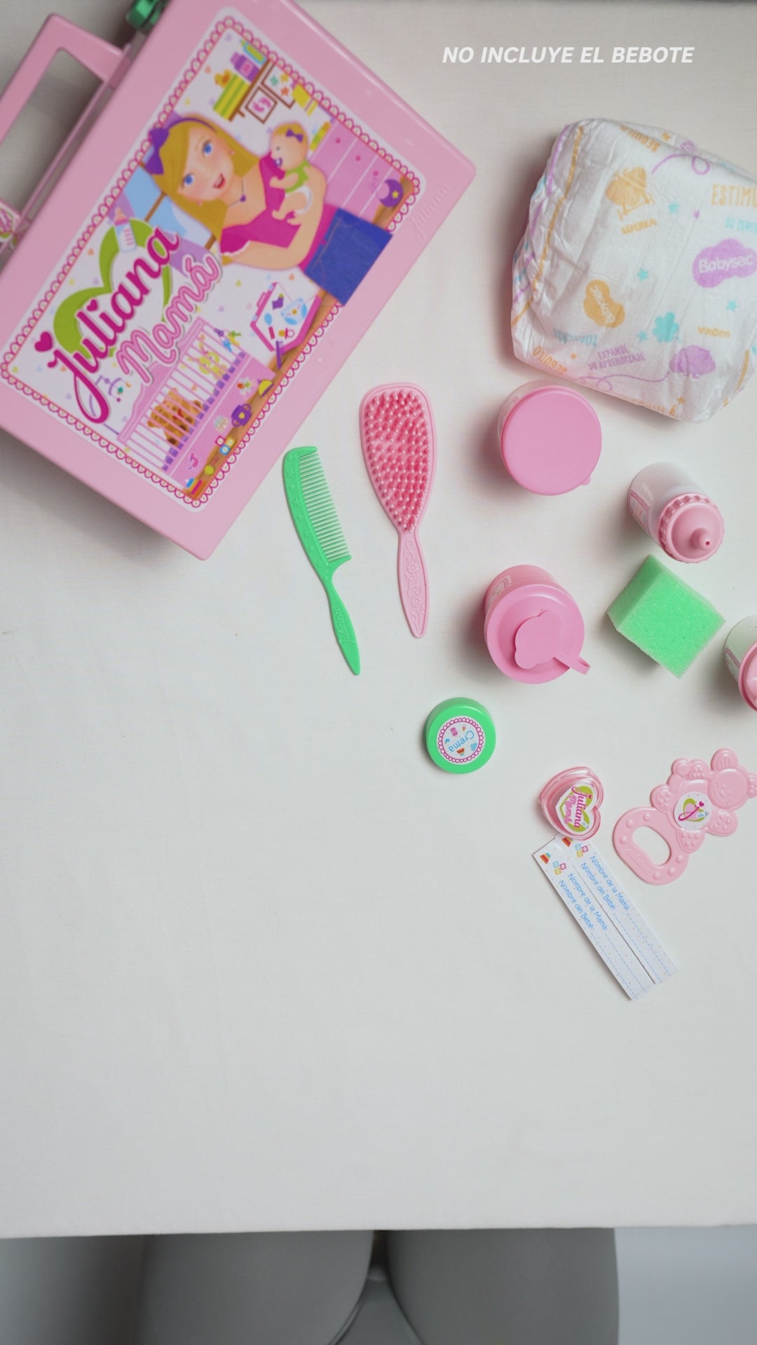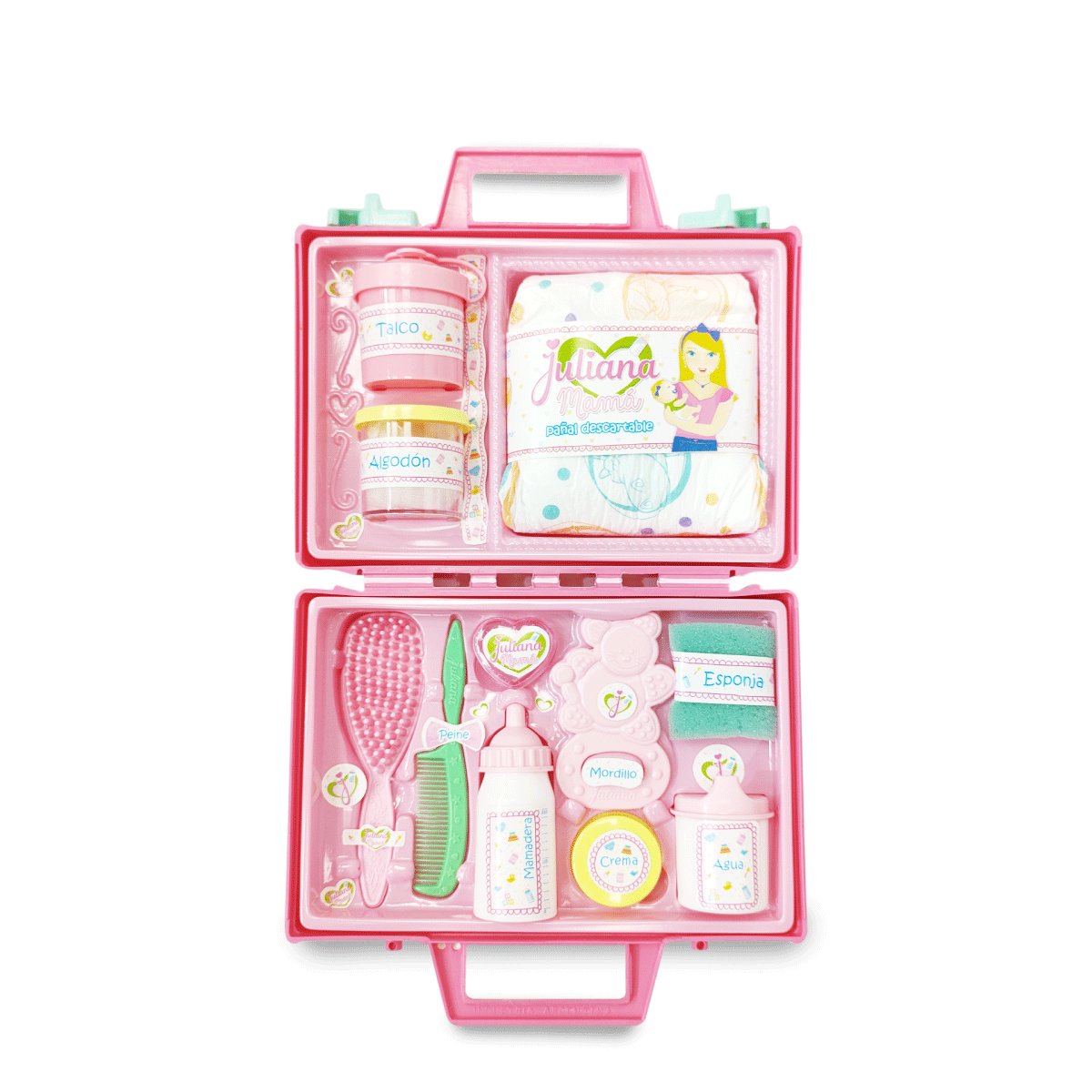 Incluye: Pañal, mamadera, peine, cepillo, mordillo, biberón de agua, esponja y recipientes de algodón, talco y crema.