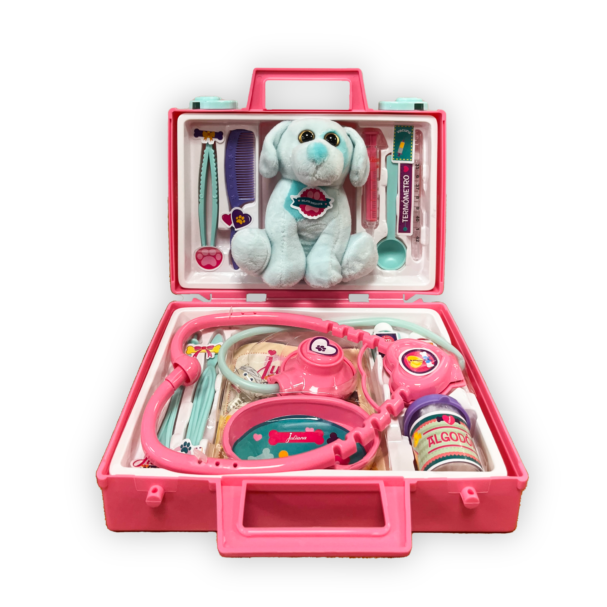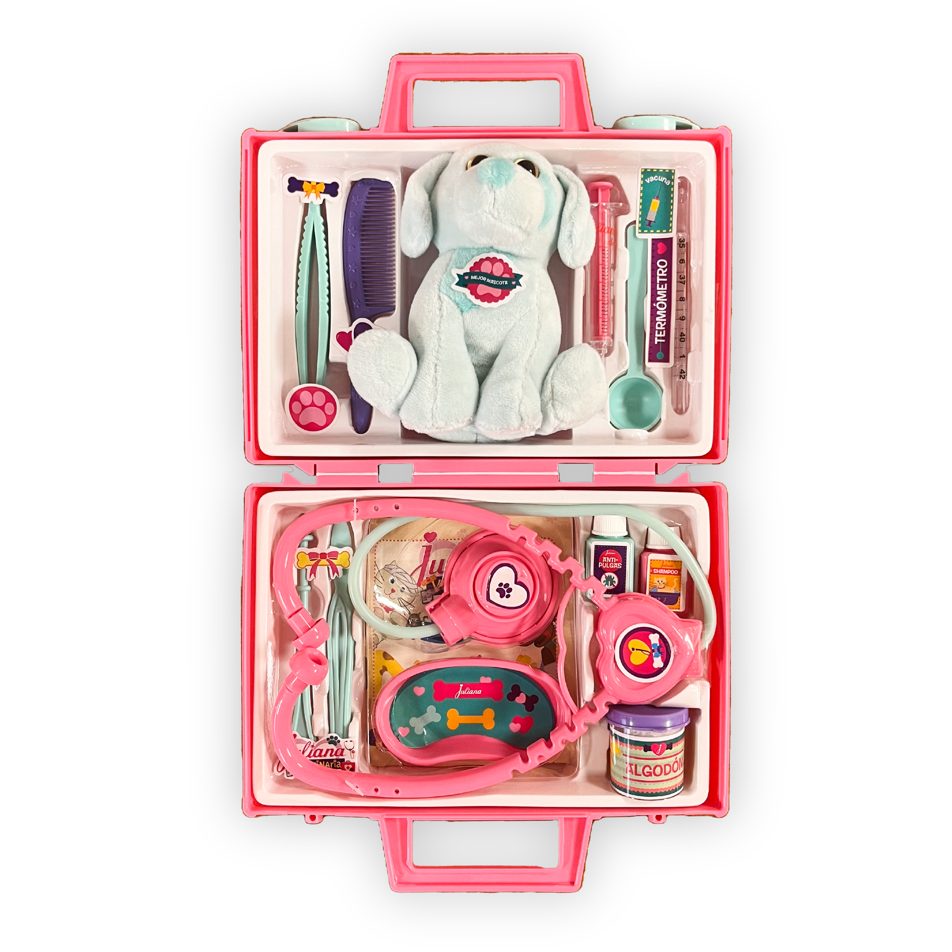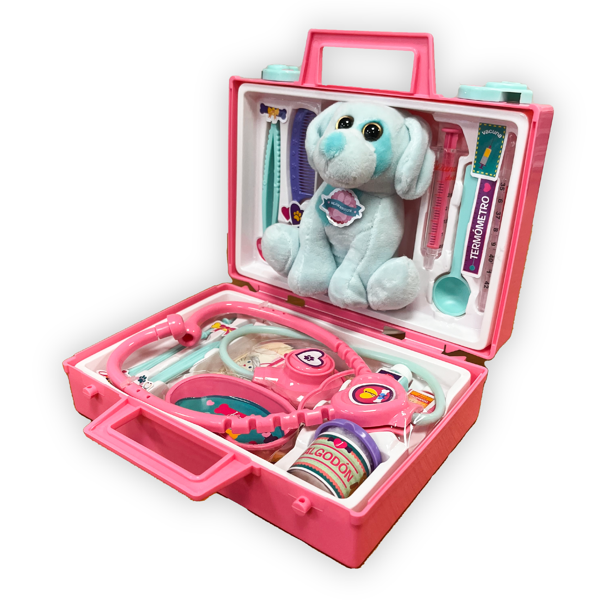 Incluye: Mascota de peluche x1 (gato o perro), estetoscopio, jeringa, termómetro, pinzas, peine, algodón, recipiente para shampoo, recipiente de anti pulgas, bandeja, cuchara y un librito de actividades sobre animales.