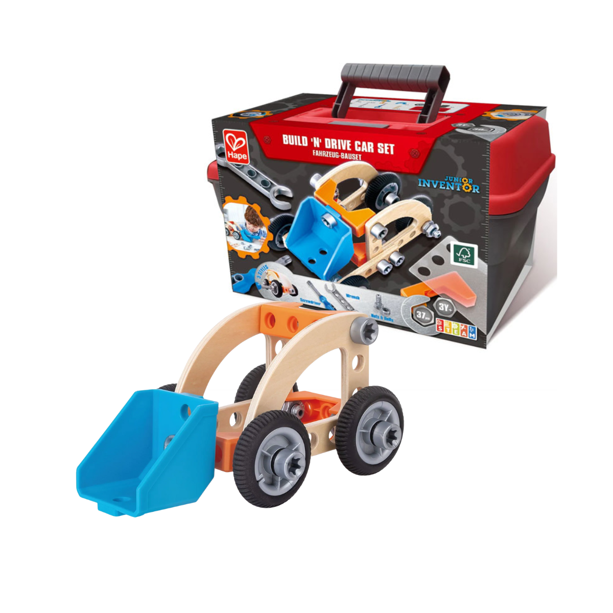 El juego incluye perfiles de madera y plástico, ruedas, tuercas, pernos, destornillador, llave inglesa y maletín de transporte. Las herramientas son seguras y fáciles de usar para manos pequeñas. Les encantará imitar el comportamiento de los adultos y participar en juegos de roles.