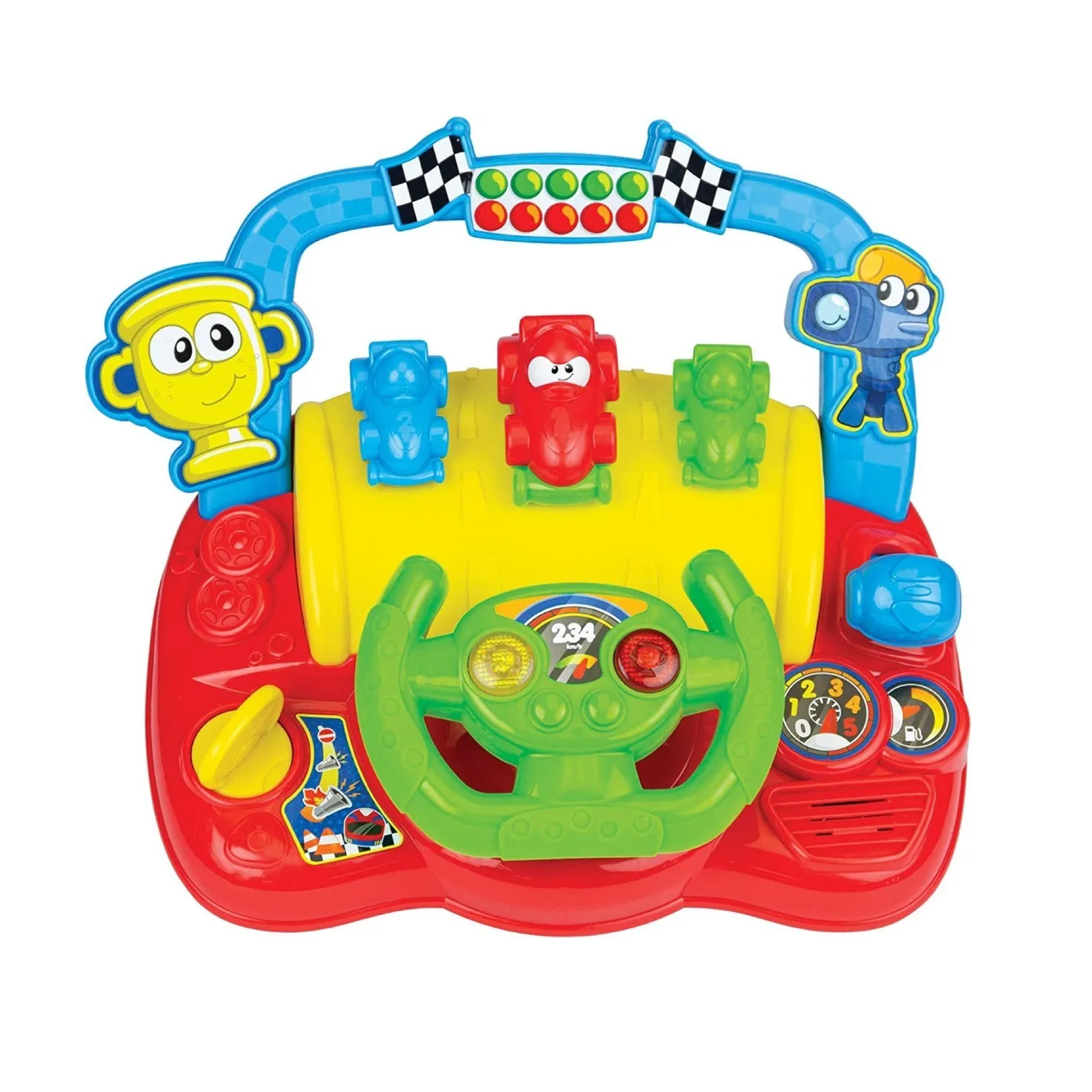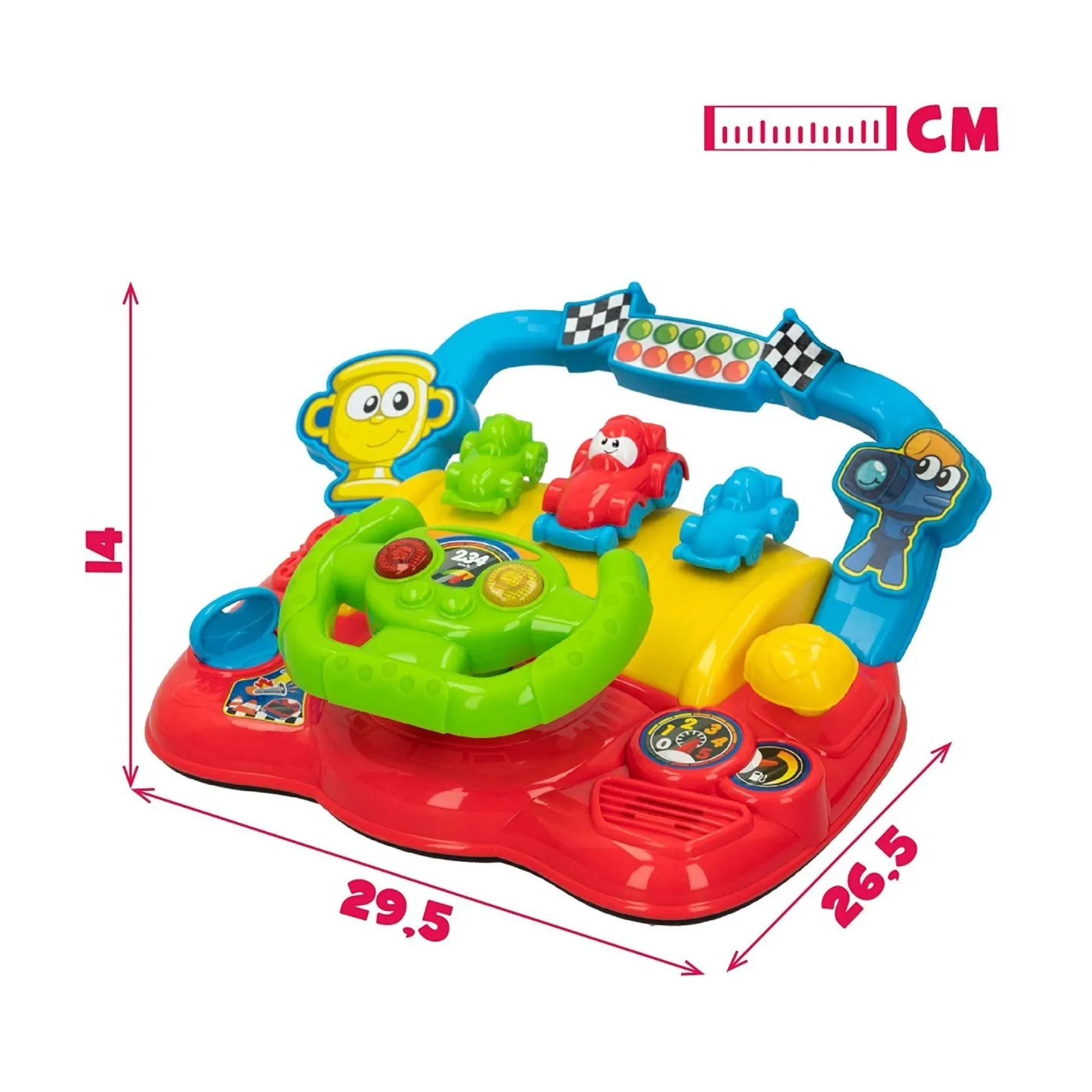 Volante interactivo con acciones de coche de carreras, al girar la llave de contacto se reproducen sonidos de arranque.